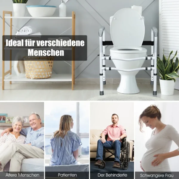 - Laisvai pastatomas tualeto turėklas su 360° besisukančiu segtuku, tinkantis daugeliui unitazų.