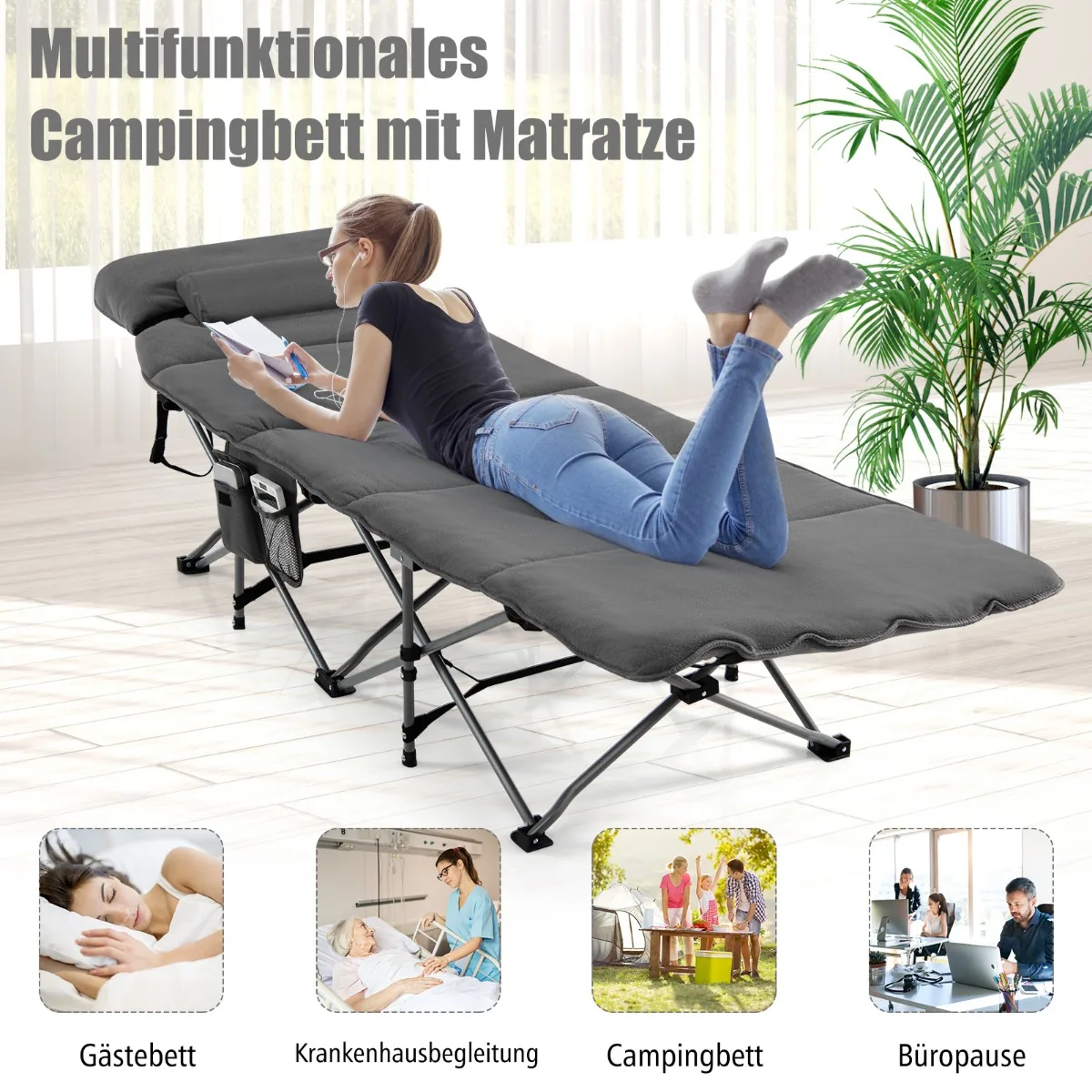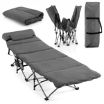 Turistinė sulankstoma lova 185x65x53cm, pilkos ir juodos spalvos – patogus ir praktiškas sprendimas stovyklavimui, žygiams arba poilsiui lauke. Ši kempingo lova pagaminta iš tvirto Oksfordo audinio ir turi nuimamą elnio odos vilnos čiužinį, užtikrinančią komfortą įvairiomis oro sąlygomis.