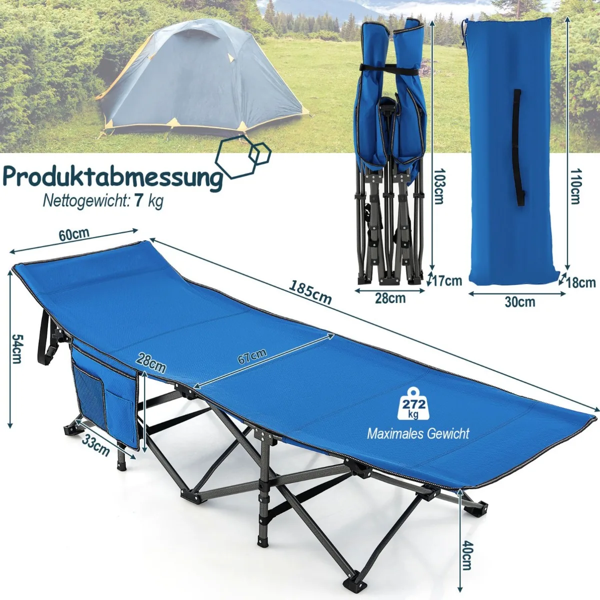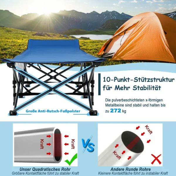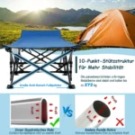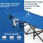 Turistinė sulankstoma lova 185x67x54cm, mėlynos/juodos spalvos, skirta patogiam poilsiui lauke. Ši nešiojama kempingo lova pasižymi dideliu stabilumu ir atsparumu, todėl tinka stovyklavimui, žygiams ar kelionėms.