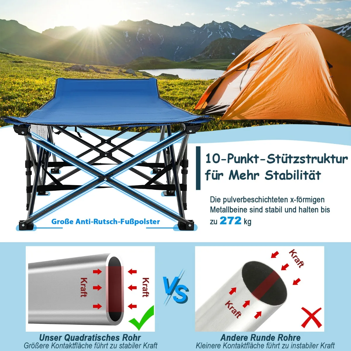 - Konstrukcija su 10 tvirtų taškų ir X formos metalinėmis kojomis užtikrina stabilumą ir turi iki 272 kg laikomąją galią.