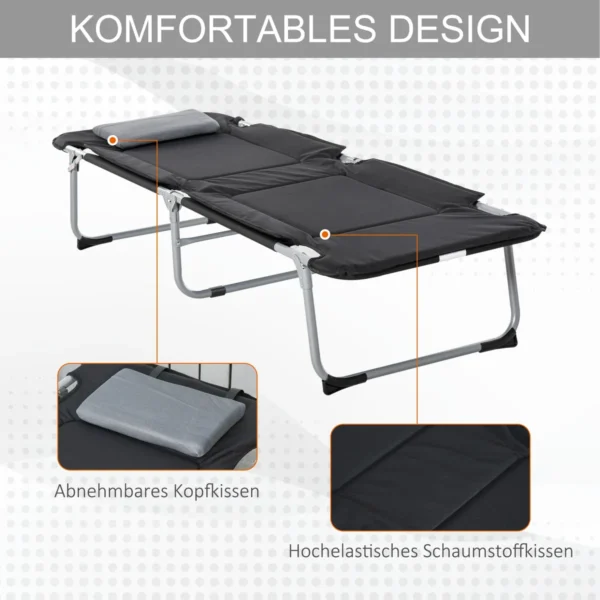 Su šia nešiojama, sulankstoma Outsunny lova, būsite pasiruošę kitoms atostogoms stovyklavietėje ar žygiams pėsčiomis. Sulankstoma lova yra lengvai transportuojama ir užima labai mažai vietos. Plieninis rėmas gali išlaikyti iki 114 kg, o patogus Oxford užvalkalas yra patogiai paminkštintas. Mėgaukitės kitomis atostogomis!