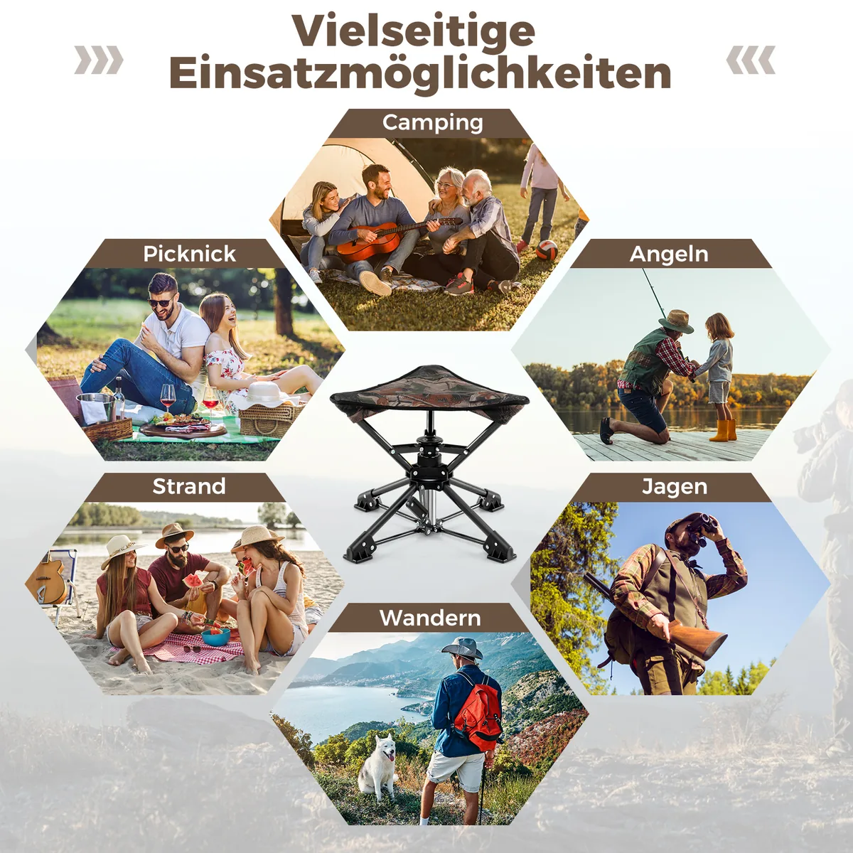- Sulankstoma turistinė taburetė su 360° besisukančiu trikoju pagrindu.
