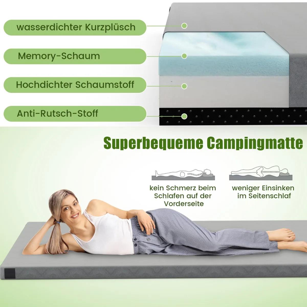 - Kilimėlis pagamintas iš vandeniui atsparaus trumpaplūšio audinio, atminties putų ir didelio tankio putplasčio, kuris mažina grimzdimą ir skausmą miego metu.