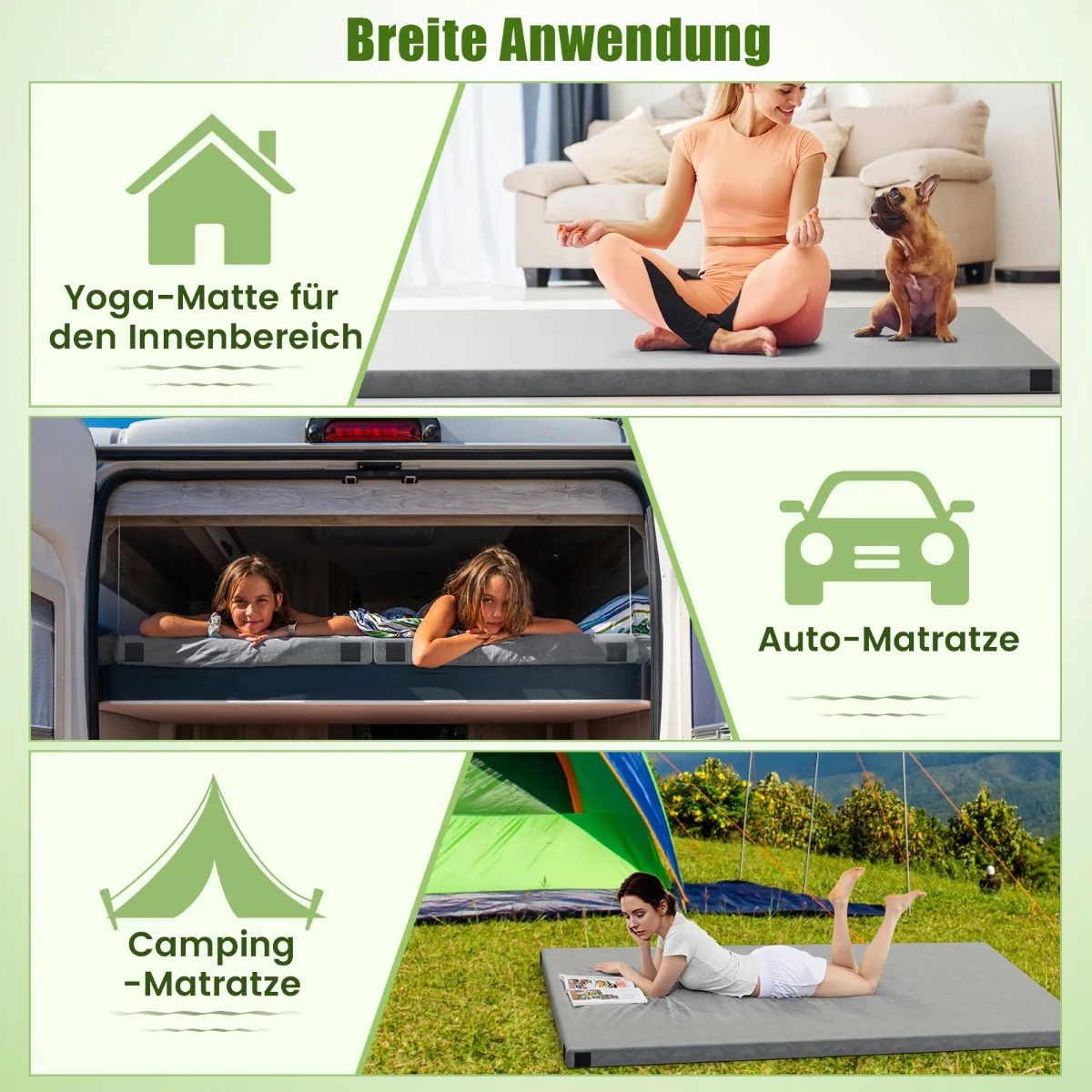 - Tinka naudoti kaip stovyklavimo kilimėlį, vidaus jogos kilimėlį ar papildomą čiužinį kelionėse.