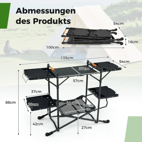 Turistinis sulankstomas stalas 135x54x88cm juodos spalvos yra praktiškas sprendimas maisto ruošimui ir laikymui lauke. Šis kempingo stalas skirtas patogiam naudojimui stovyklautojams, iškylų mėgėjams ir kitiems lauko veiklų entuziastams.