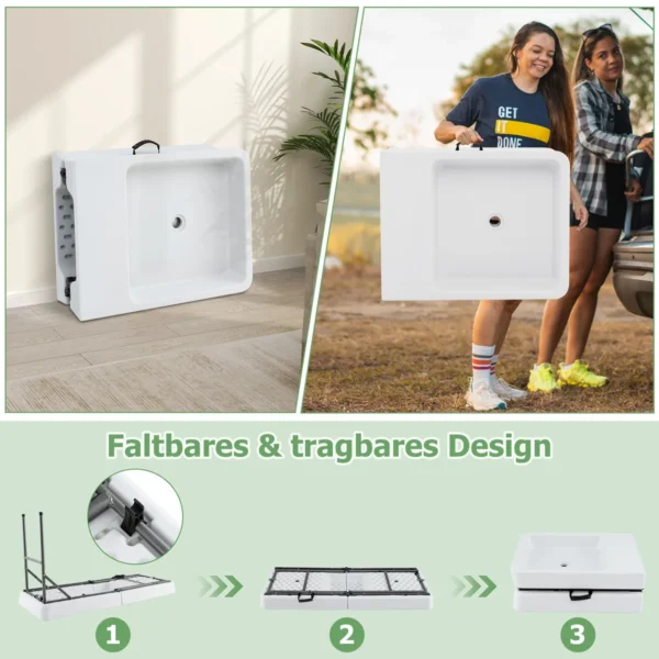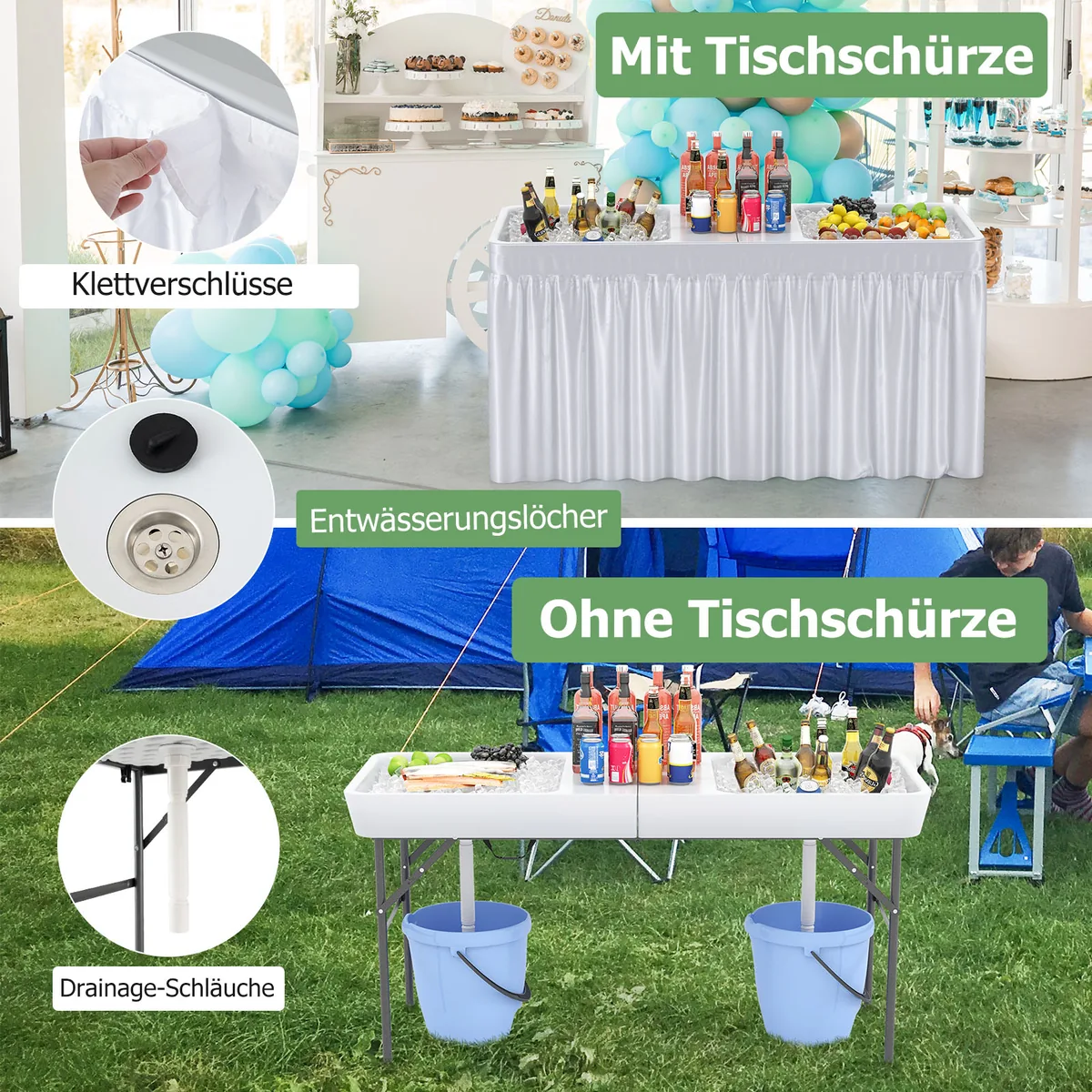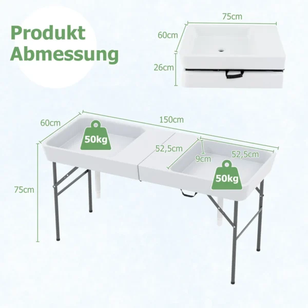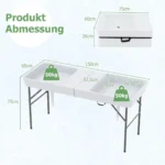 Turistinis sulankstomas stalas 150x60x75cm baltos/pilkos spalvos yra praktiškas sprendimas išvykoms, piknikams ir lauko renginiams. Stabilus metalinis rėmas ir oro sąlygoms atsparus HDPE stalviršis užtikrina ilgaamžiškumą bei patogų naudojimą lauke. Dvigubi baseinai leidžia efektyviai vėsinti gėrimus ir maistą.