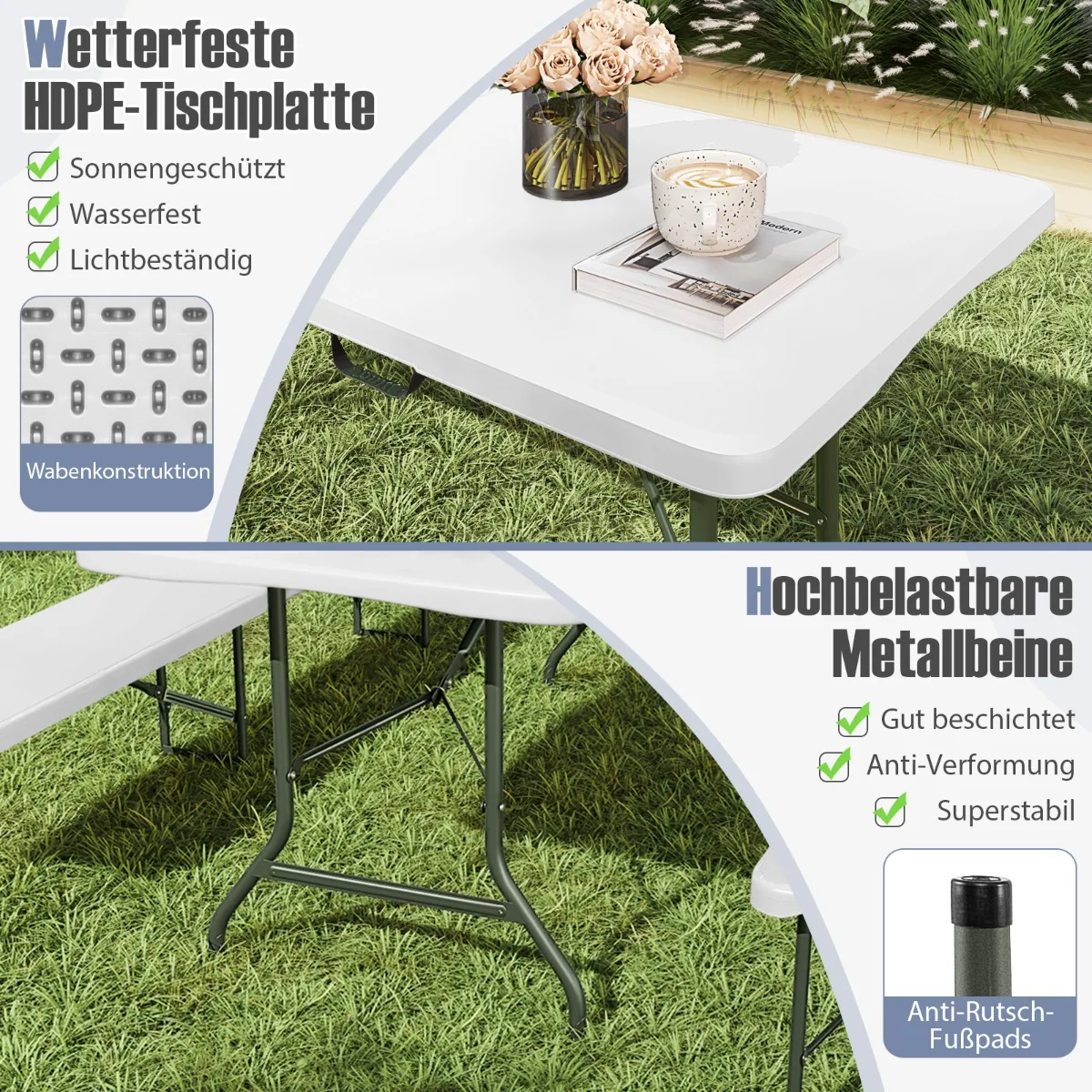 - HDPE stalviršis su korine struktūra papildomam stabilumui ir atsparumui saulės spinduliams bei vandeniui.