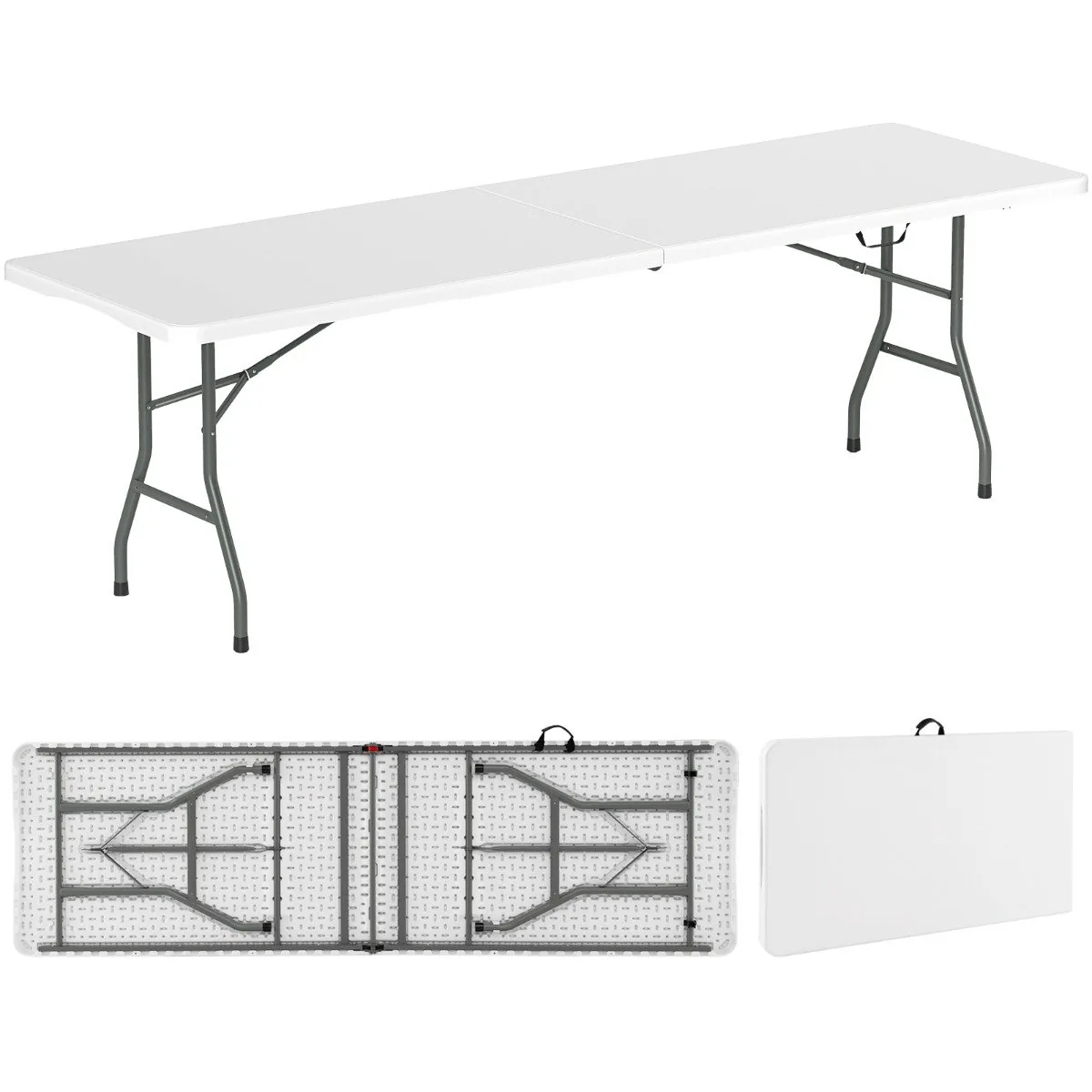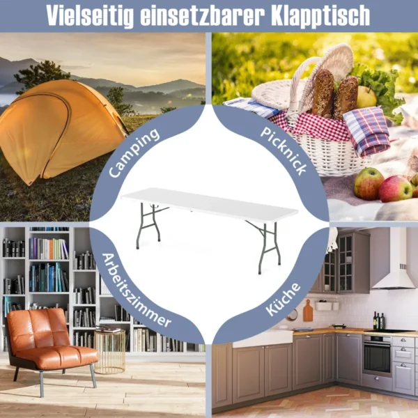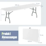 Turistinis sulankstomas stalas 245x74x75 cm yra praktiškas sprendimas lauko veikloms, tokioms kaip stovyklavimas ar iškyla. Jo patvarus HDPE stalviršis ir tvirtos metalinės kojelės užtikrina stabilumą ir ilgaamžiškumą naudojant lauke.