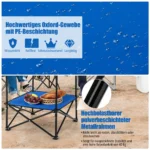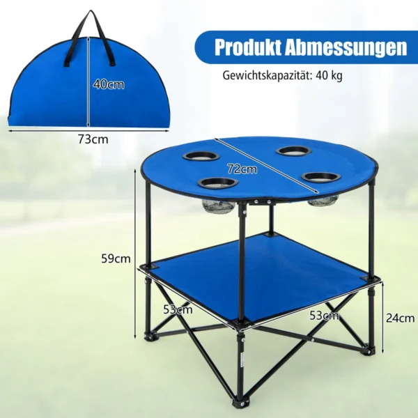Turistinis sulankstomas stalas 72×59 cm, mėlynos ir juodos spalvos, skirtas patogiam naudojimui lauke. Lengvas ir nešiojamas stalas puikiai tinka stovyklavimui, iškyloms, žvejybai ar kitoms lauko veikloms. Patogus dizainas su dviem lentynomis ir puodelių laikikliais užtikrina funkcionalumą bei stabilumą.