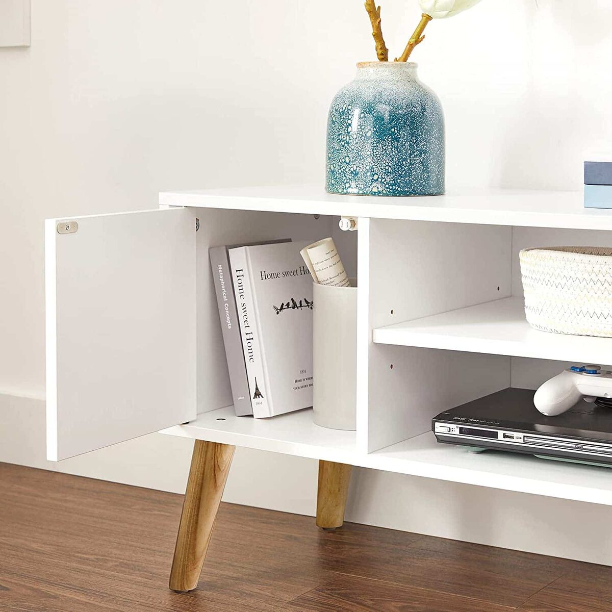 Spintelė pagaminta iš aukštos kokybės medžio drožlių plokštė (MDP) ir gumos, užtikrinančios ilgaamžiškumą ir patvarumą. Jos matmenys yra 110 x 40 x 49,5 cm , o svoris siekia 18,9 kg. Maksimali statinė apkrova yra 50 kg, todėl galite saugiai laikyti savo televizorių ir kitus prietaisus.
