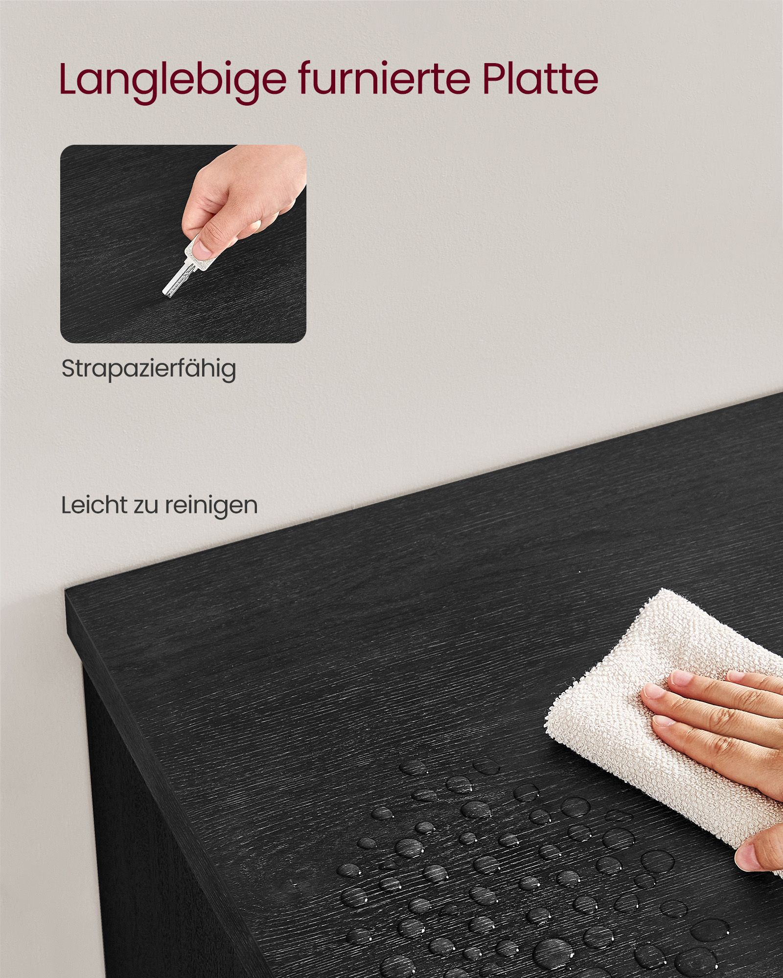 - Medžiaga: Pagaminta iš aukštos kokybės medžio drožlių plokštės ir grūdinto stiklo, užtikrinančio ilgaamžiškumą ir patvarumą.