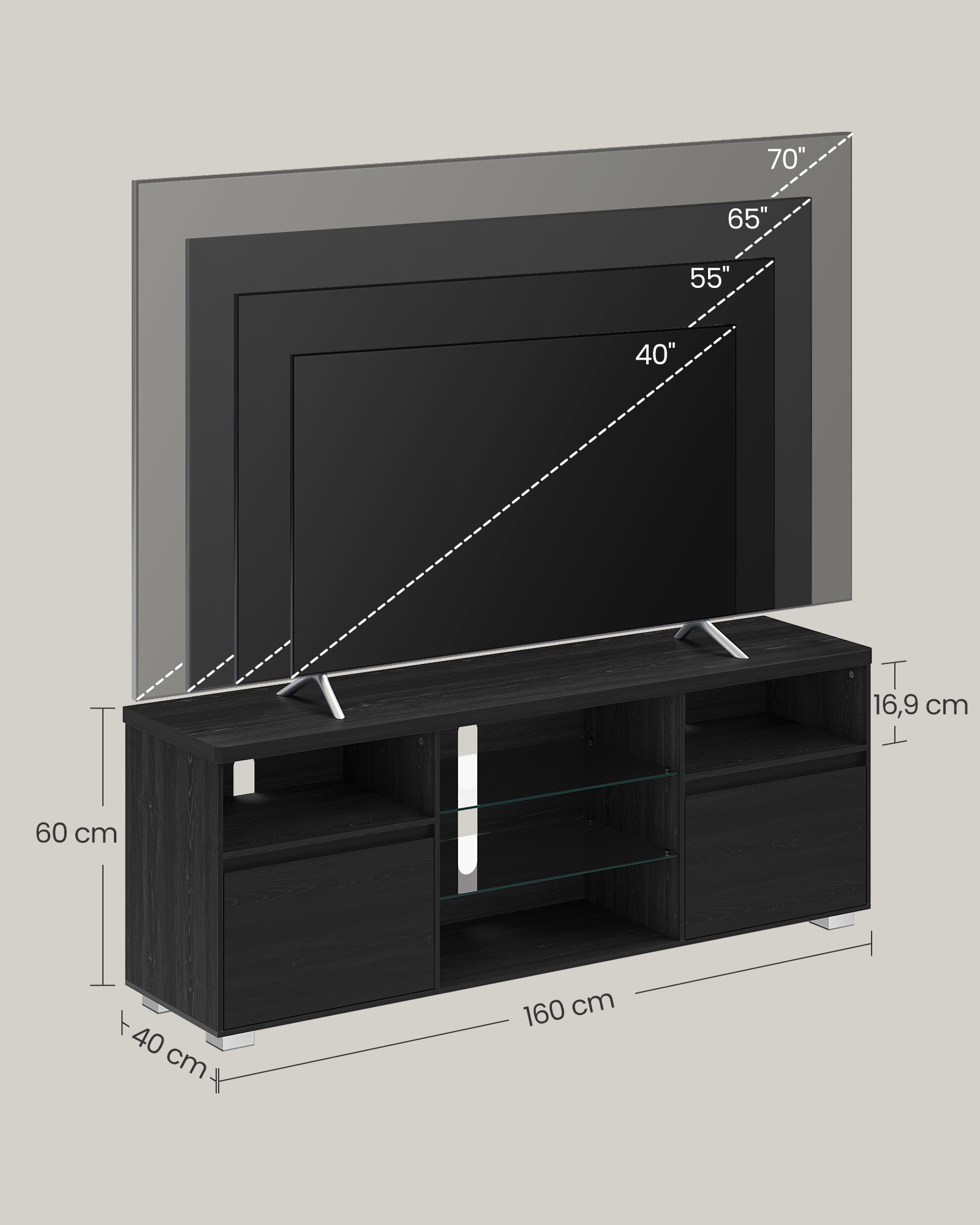 - Maksimali stalviršio statinė apkrova: 40 kg – pakankamai tvirta, kad laikytų Jūsų televizorių ir kitus prietaisus.