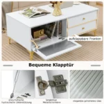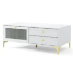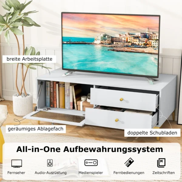 TV staliukas 120x62x46cm baltos ir auksinės spalvos puikiai tinka televizoriams iki 55 colių. Šis TV stovas suteikia patogias saugojimo galimybes ir stabilų pagrindą įvairiai pramogų įrangai.