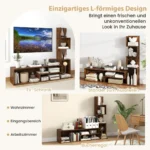- L formos lentynos suteikia papildomos vietos medijos įrenginiams, knygoms ir dekoracijoms.