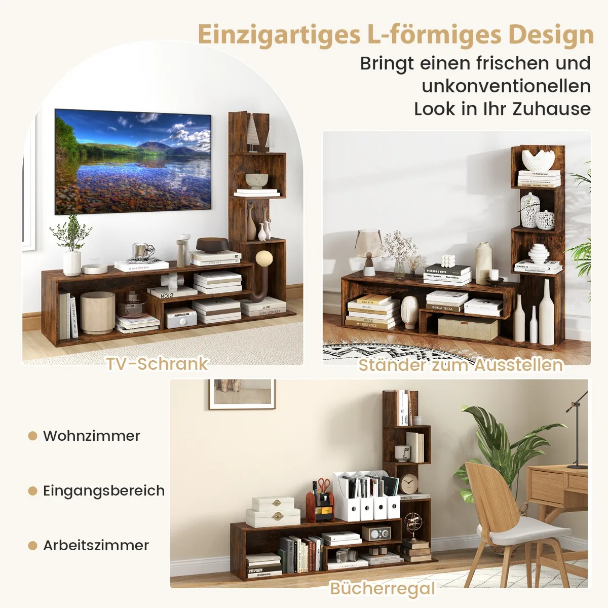 TV staliukas 144,5×29,5×121 cm, rudos spalvos, skirtas plokščiaekraniams televizoriams iki 50 colių. Šis medinis televizoriaus stovas su daiktadėže ir L formos lentynomis leidžia patogiai tvarkyti medijos įrenginius bei užtikrina stabilumą naudojant apsaugos nuo apsivertimo sistemą.