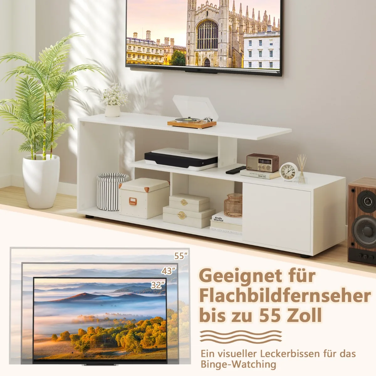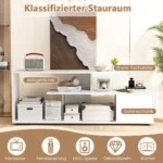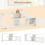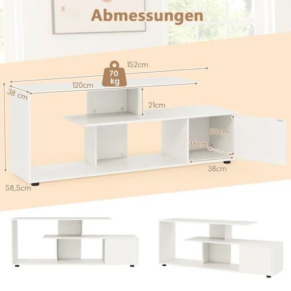 TV staliukas 152x38x58,5 cm baltos spalvos yra praktiškas sprendimas namų pramogų zonai. Jis skirtas plokščiaekraniams televizoriams iki 55 colių ir suteikia patogią vietą ne tik televizoriui, bet ir papildomiems medijos įrenginiams laikyti.