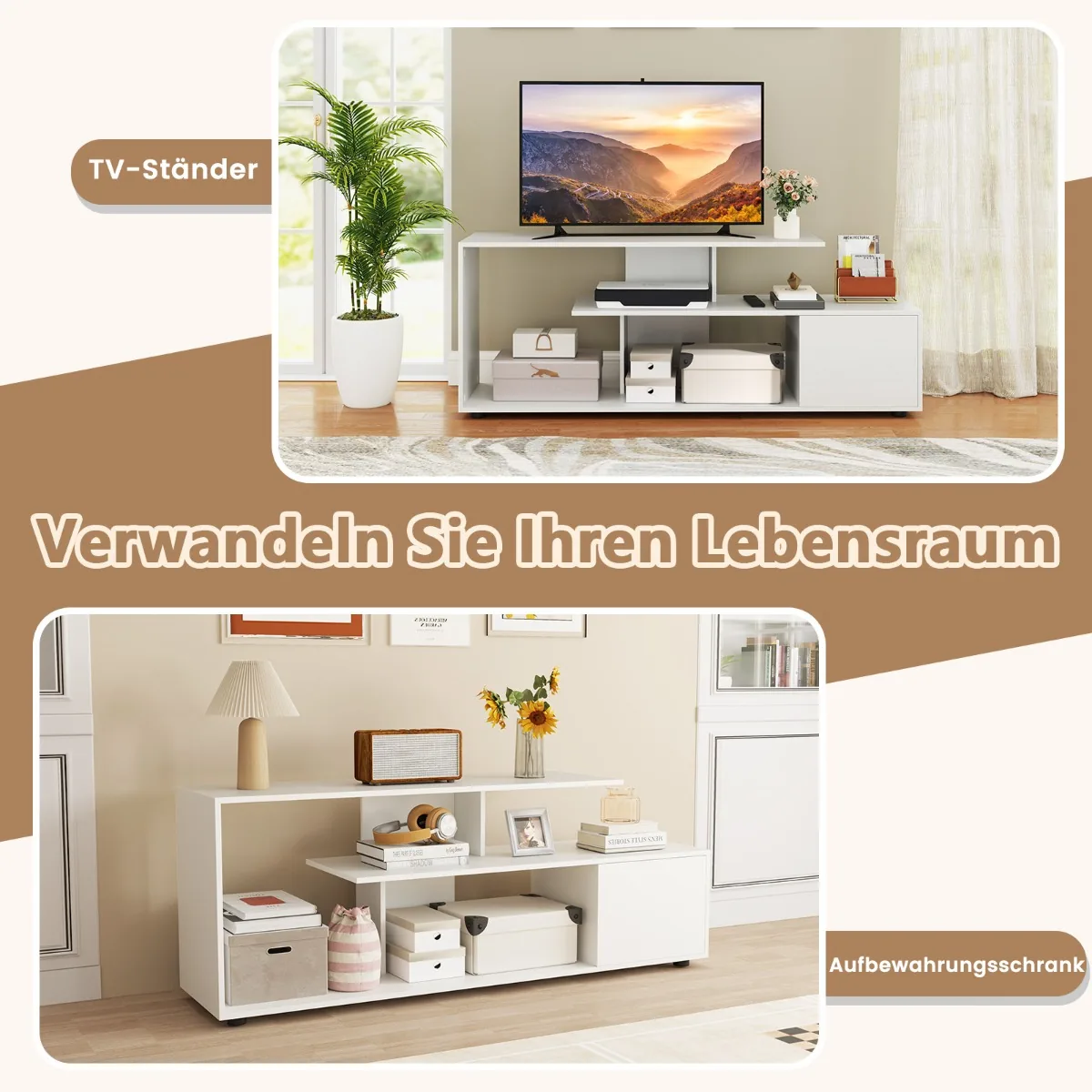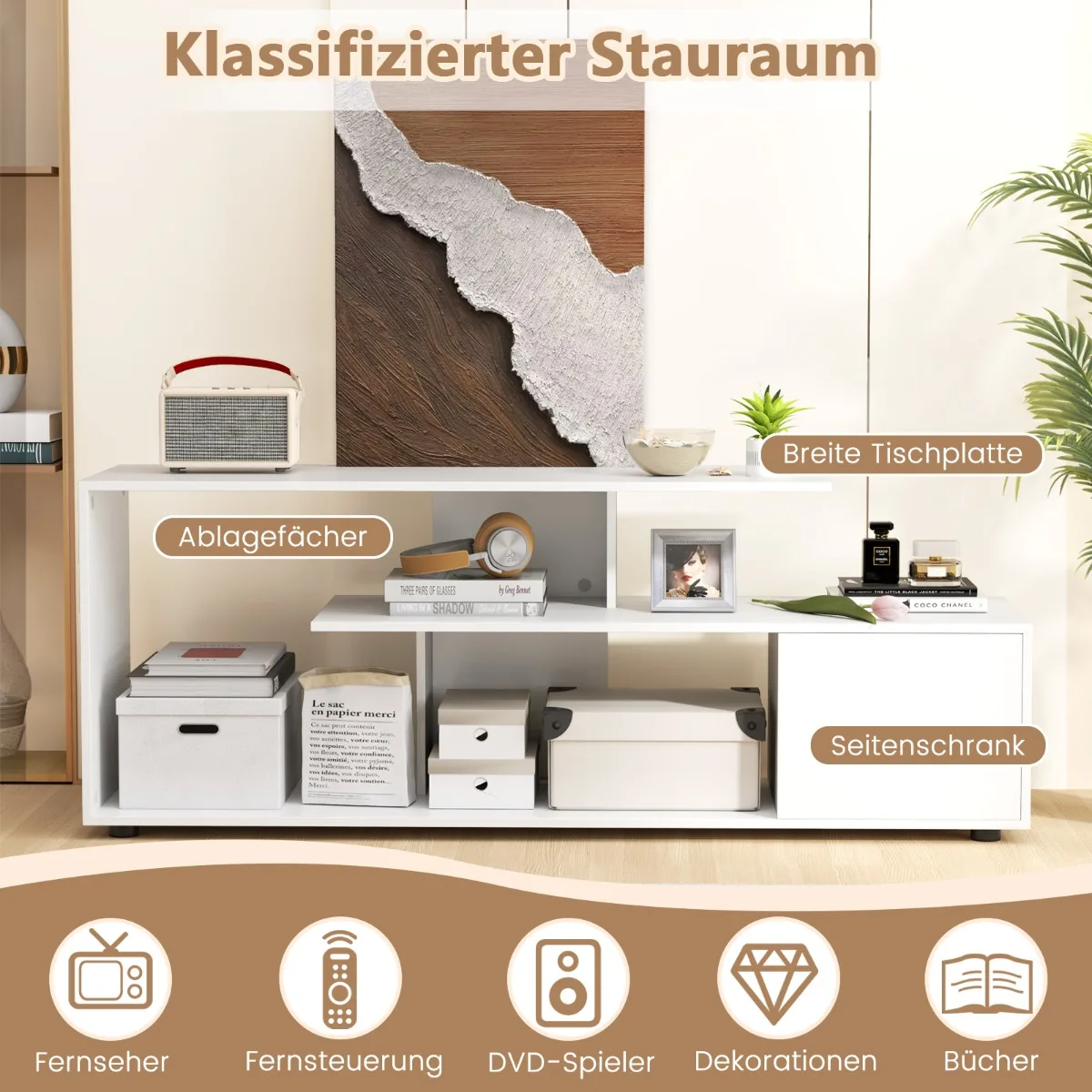 - Įrengtos atviros lentynos patogiam nuotolinio valdymo pulto, DVD grotuvų, knygų ir dekoracijų laikymui.