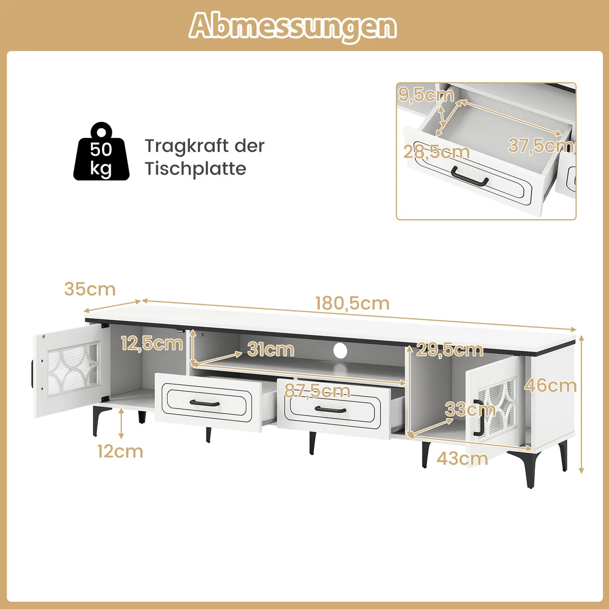 TV staliukas 180,5x35x46 cm baltos spalvos yra sukurtas patogiai ir funkcionaliai pramogų erdvei. Jis skirtas plokščiaekraniams televizoriams iki 80 colių ir suteikia pakankamai vietos medijos įrenginiams bei kitoms smulkmenoms.
