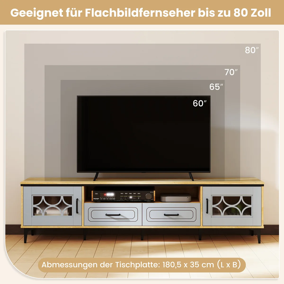 TV staliukas 180,5x35x46 cm yra skirtas plokščiaekraniams televizoriams iki 80 colių. Šis televizoriaus stovas suteikia pakankamai vietos įvairiems multimedijos įrenginiams ir aksesuarams, padedant išlaikyti tvarką pramogų zonoje. Komplekte yra stalčiai, spintelės ir atviri skyriai, kurie prisideda prie patogesnio naudojimo.