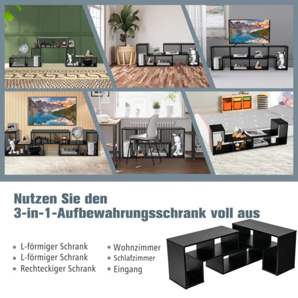 - Lentynos gali būti sukrautos arba pasuktos, taip sukuriant kampinę spintelę ar žemą konsolę.