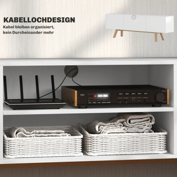 Įsigykite praktišką ir stabilią prieglobstį savo televizoriui! Dvi spintelės ir dvi vidurinės TV spintelės lentynos puikiai tinka konsolėms, DVD ir nuotolinio valdymo pultams laikyti, o TV plokštės paviršius palaiko iki 65 colių televizorius. Tvarkingą įspūdį užtikrina ir televizoriaus suoliuko įmontuotos skylės elektros laidams.