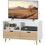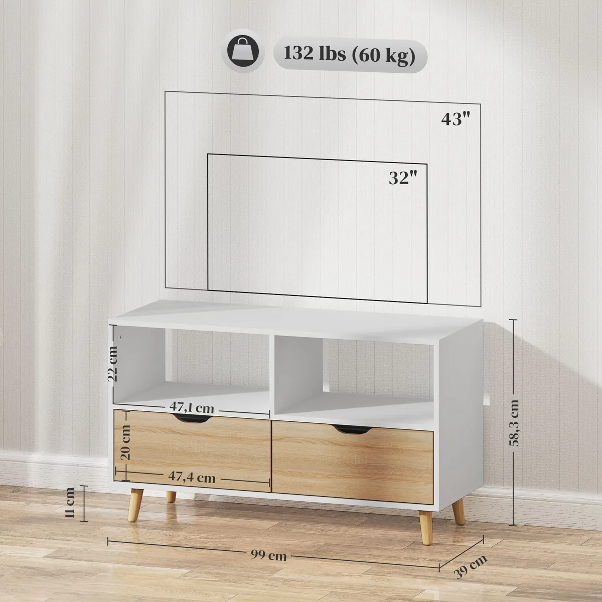 Ši HOMCOM televizoriaus apatinė spintelė suteiks jūsų svetainei ar miegamajam stilingą ir šiuolaikišką dekorą. Televizoriaus žema lenta pagaminta iš patvarios, kokybiškos medžio drožlių plokštės su melamino dervos danga ir gali išlaikyti iki 60 kg. Televizoriaus suoliuko laikymo skyriuose ir stalčiuose taip pat yra daug vietos vaizdo žaidimams, DVD diskams, nuotolinio valdymo pultams ir kt. laikyti.