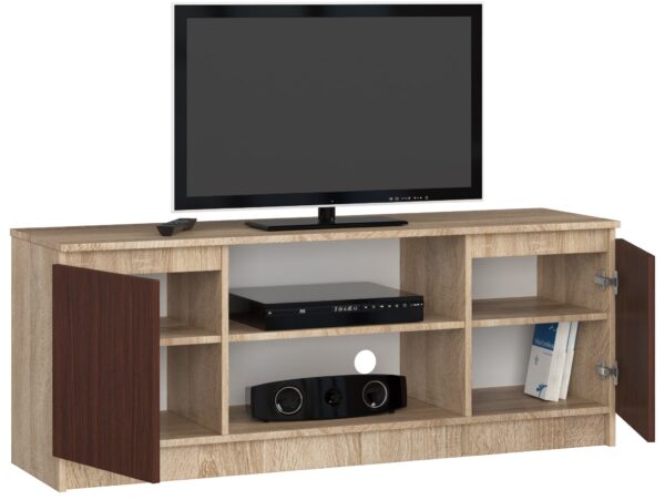 Televizoriaus stovas yra praktiškas baldas, kuris bus naudojamas ne tik svetainėje. Jis gali suteikti idealią vietą įrangai, taip pat laikyti kitus reikalingus daiktus tam tikroje patalpoje. TV spintos gali būti įvairių formų. Mūsų siūlomas baldas yra dviejų įdomių spalvų derinys – tamsi, tamsiai rudos spalvos ir šviesi, ąžuolo spalvos. Šis harmoningas duetas tikrai patiks žmonėms, ieškantiems unikalaus sprendimo savo įrengtam kambariui. Spintelė pagaminta iš geros kokybės medžiagos, kuri pasižymi atsparumu trinčiai ir ilgaamžiškumu. Dėl kruopštaus darbo, funkcionalumo ir palankios kainos televizoriaus stovas yra populiarus pasirinkimas tarp mūsų parduotuvės klientų. – Komoda iš dilimui atsparios laminuotos plokštės – Stalčių fasadai pagaminti iš laminuotos plokštės – Kiekvienos durelės viduje yra po vieną lentyną – Kraštai padengti ABS briauna, kad būtų apsaugota nuo pažeidimų – Komoda savaiminiam surinkimui – Instrukcija pridedama – Garantija 24 mėn. – Pažymėtina vieta garso įrangai / dekoderiui, kuris tilps beveik kiekvienas modelis mūsų rinkoje