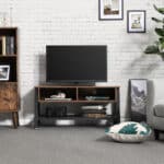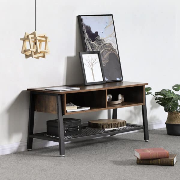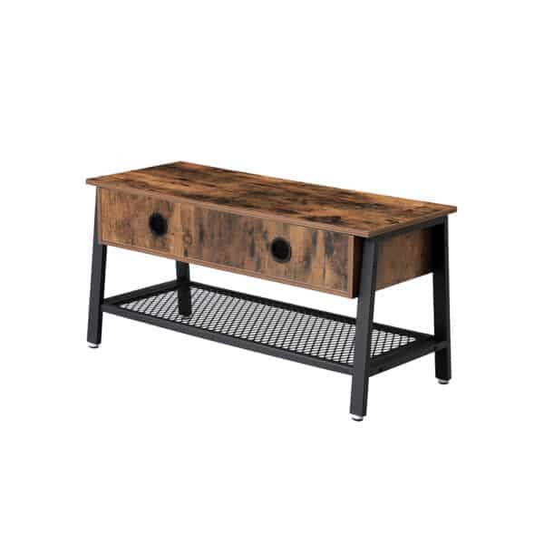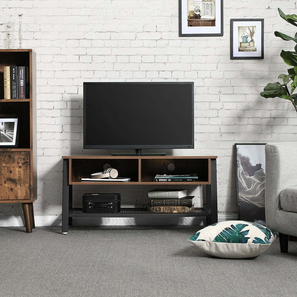 Pagamintas iš aukštos kokybės medžio drožlių plokštė (MDP) ir plieno, šis TV staliukas yra tvirtas ir ilgaamžis. Jo vintažinė ruda-juoda spalva puikiai dera prie įvairių interjero stilių.