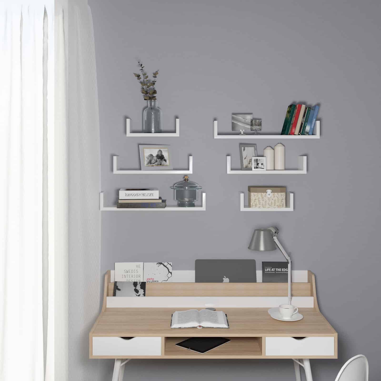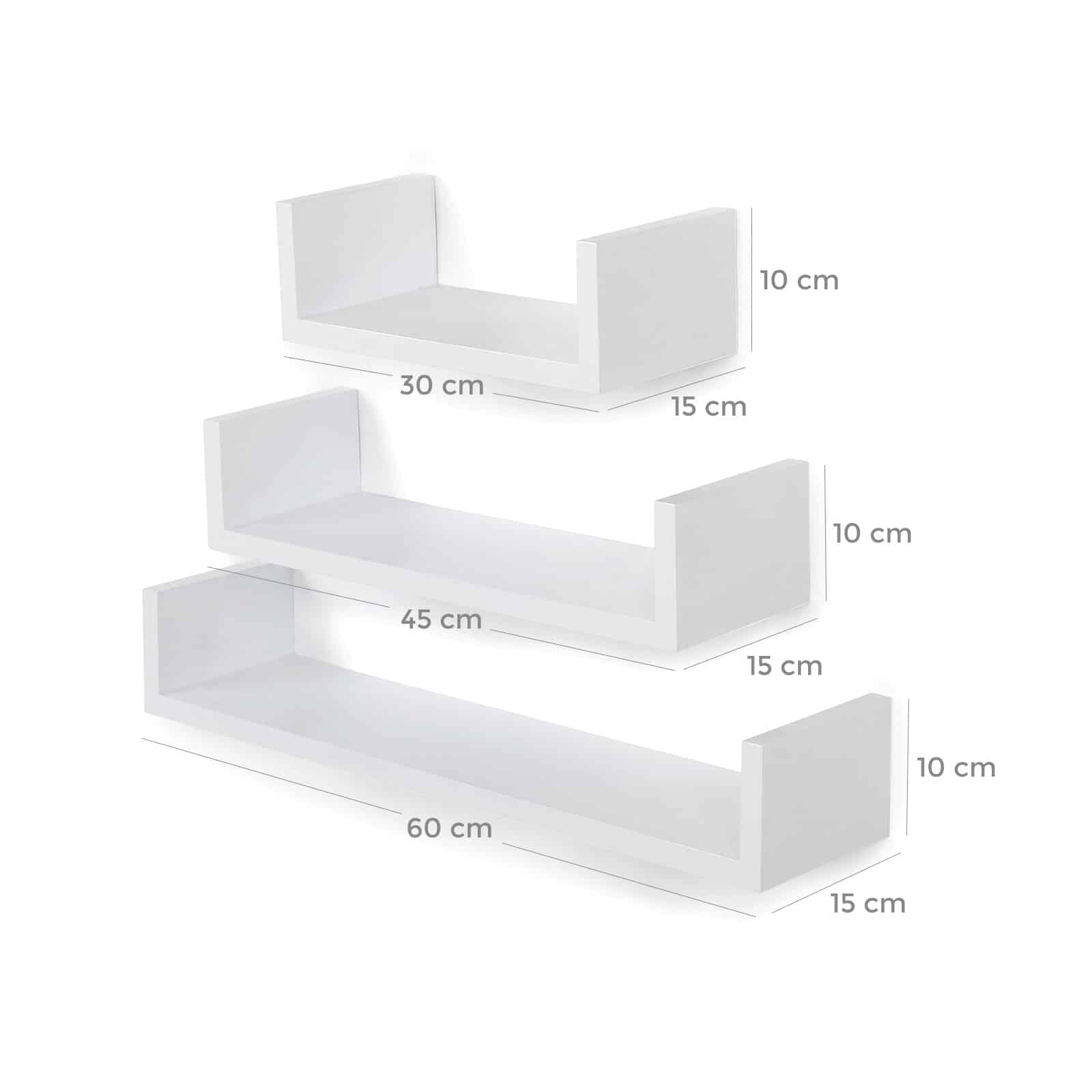Šis madingas 3 U formos lentynų rinkinys tikrai traukia akį! Songmics lentynų komplektą sudaro medžio dulkių plokštė (MDF)s, kurios buvo išbandytos pagal E1 standartą. Jis yra atsparus drėgmei, nėra lengvai deformuojamas ir turi didelį atsparumą. Lengva montuoti dėl integruoto nematomo sieninio laikiklio.