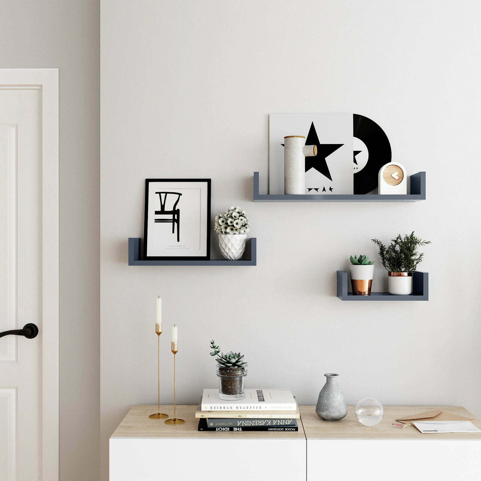 Galite pritvirtinti šias plaukiojančias lentynas prie sienos naudodami nematomas metalines pakabas. Dvi lentynos viena ant kitos arba kai kurios apverstos, o kai kurios nukreiptos į viršų pačiu įprastu būdu… Maišykite ir derinkite šias lentynas, kad sukurtumėte unikalias formas. Norėdami įkvėpti, pažiūrėkite į mūsų pavyzdinius vaizdus!