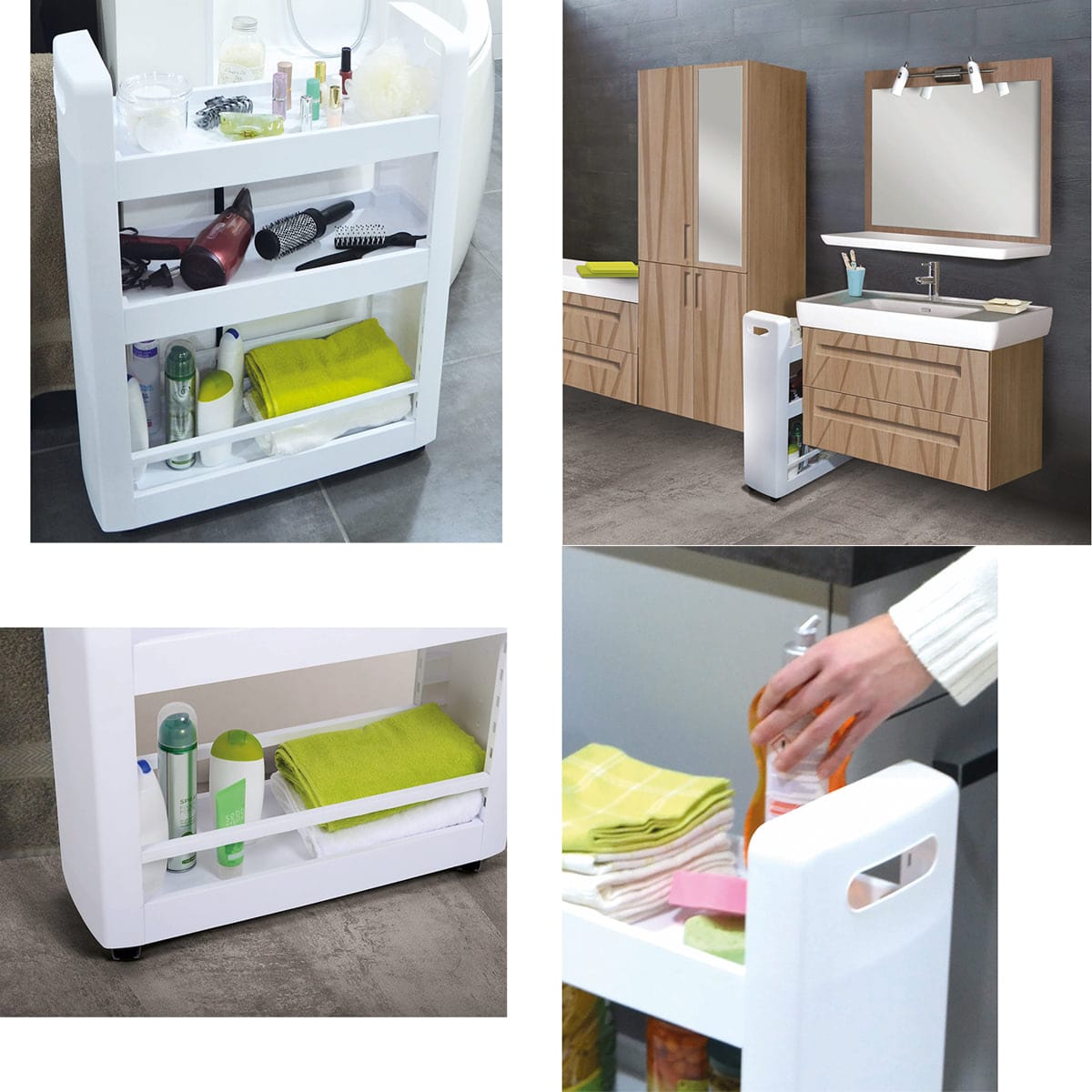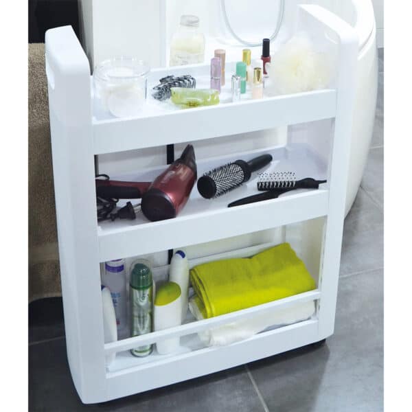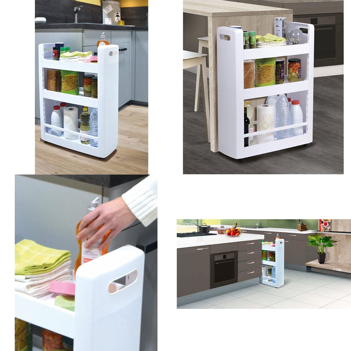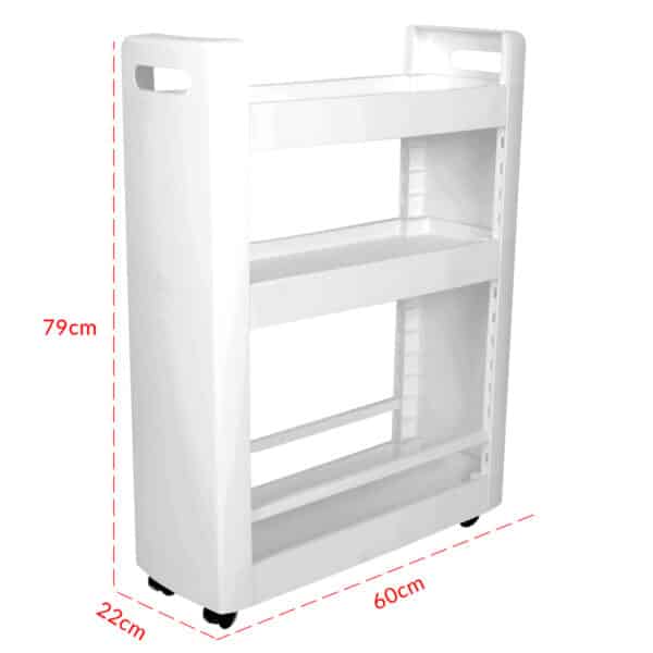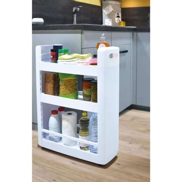 Universali ir daugiafunkcinė spintelė ant ratukų, tilps net ir labai mažoje erdvėje, suteikdama papildomos vietos daiktams laikyti. Tai leidžia maksimaliai išplėtoti mažą patalpą ir tuo pačiu leidžia patogiai pasiekti saugomus daiktus. Galima dėti tarp baldų arba ten, kur mažai vietos. Puikiai tiks mažam vonios kambariui, į lentynas nesunkiai susidėsite bet kokią kosmetiką ar skalbimo priemones. Tai palengvina nenaudojamos ar niekuo neišsiskiriančios erdvės formavimą virtuvėje, ją galite pastatyti tarp spintelių arba paslėpti po stalu, tada lentynose lengvai tilps skardinės, buteliai, virtuvės reikmenys ar virtuvės knygos. Spintelė turi 4 ratus, todėl ją lengva perkelti. Dėl baltos spalvos ir paprasto rašto jis tinka daugumoje interjerų, dėl savo paprastumo užima mažai vietos. Lengvas surinkimas, nereikia jokių įrankių Bet koks lentynų reguliavimas. Pasukami ratukai Spalva: balta, juodi ratai Matmenys: 79,0 cm x 60,0 cm x 22,0 cm Medžiaga: polipropilenas