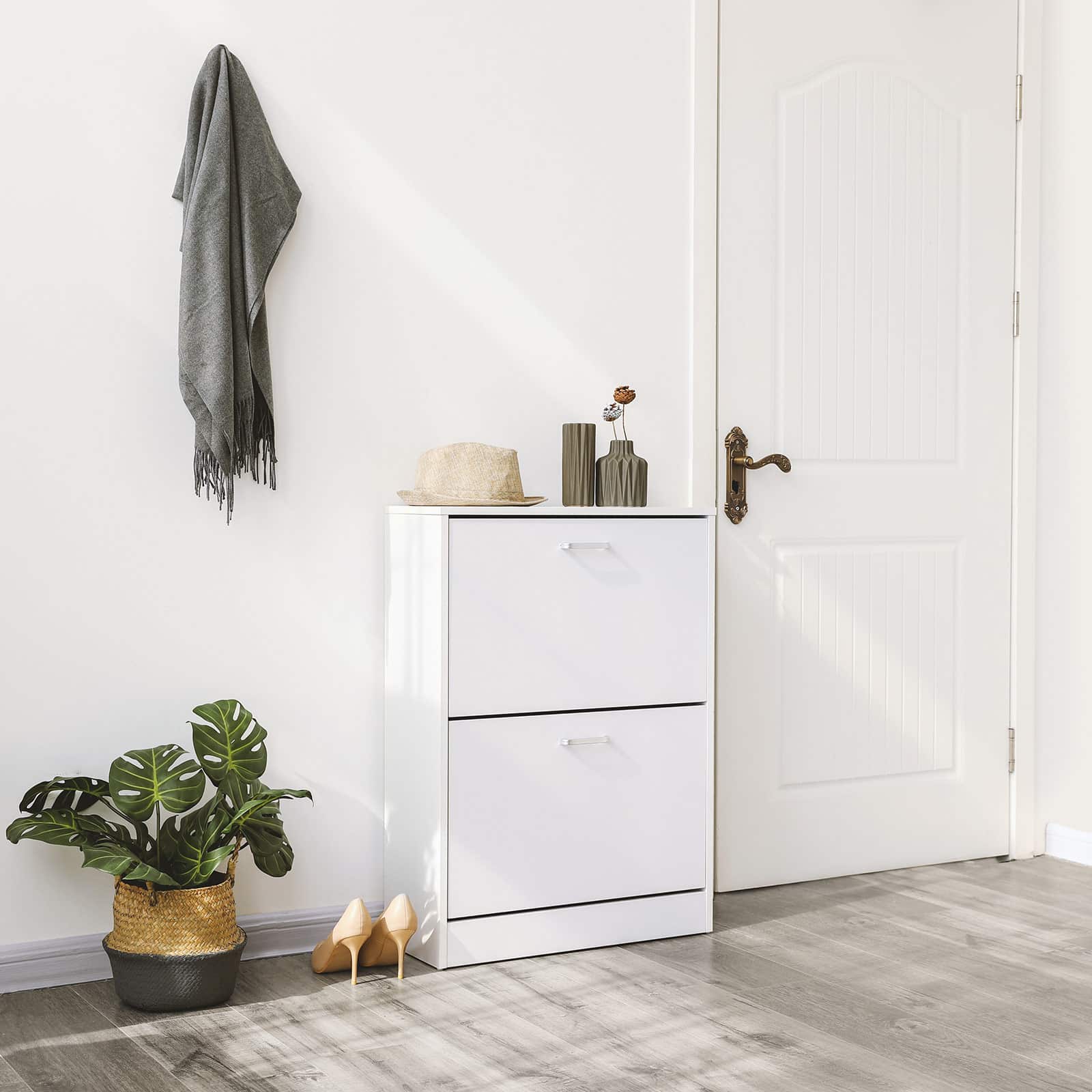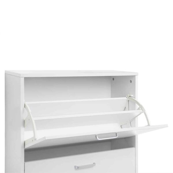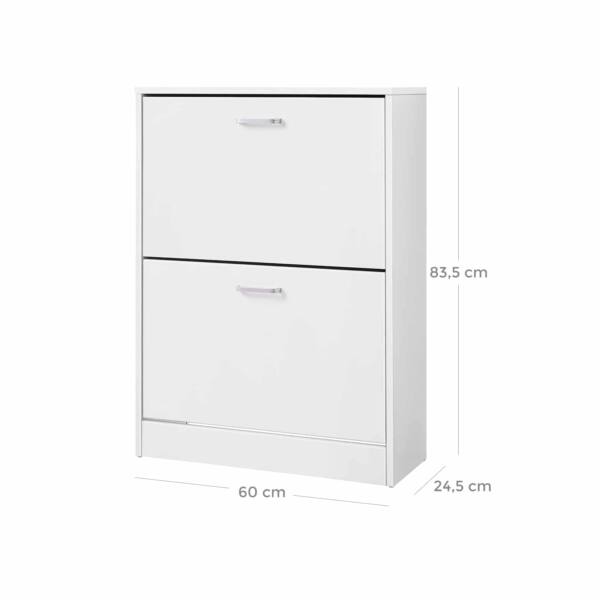 Pagaliau galite atsikratyti batų chaoso, tvarkingai susidėję visus savo batus mūsų uždaroje batų spintelėje, baltos spalvos! Su savo elegantišku baltu paviršiumi, ši batų spintelė sukuria subtilią ir švarią atmosferą jūsų namuose.