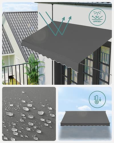 Ar norėtumėte markizės be skylių? Tada ši SONGMICS balkono markizė kaip tik jums. Jokio gręžimo ar varžtų – tereikia surinkti rėmą ir sureguliuoti stulpų bei markizės aukštį, kad stulpai tvirtai įsitvirtintų tarp grindų ir lubų.