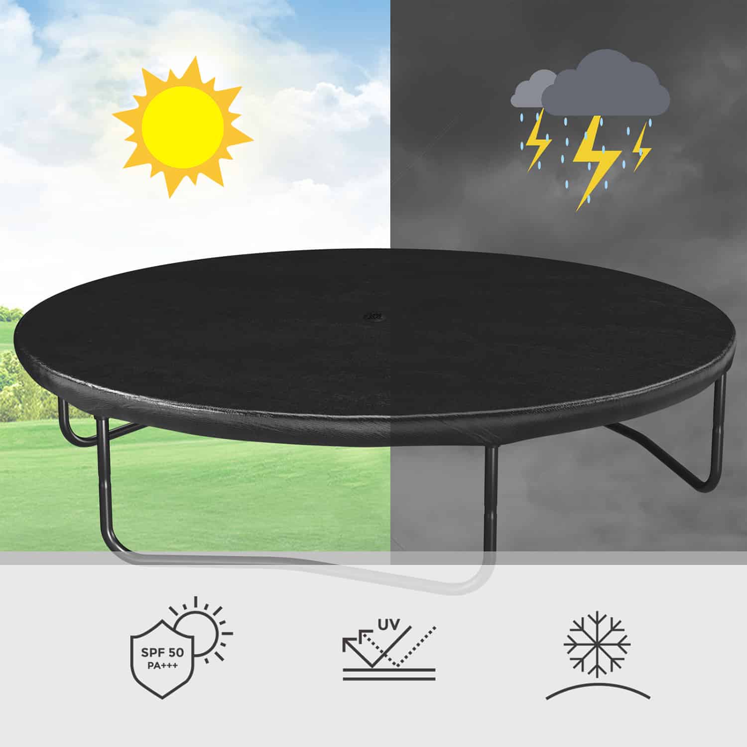 Pagamintas iš aukštos kokybės PE (polietileno) medžiagos, užvalkalas yra atsparus vandeniui ir UV spinduliams, todėl jūsų batutas išliks saugus ir švarus visą sezoną.