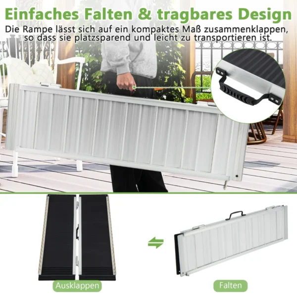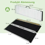 Užvažiavimo rampa 122x74x5,5 cm juodos ir sidabrinės spalvos – patikimas sprendimas neįgaliųjų vežimėliams ir kitiems judėjimo pagalbiniams įrenginiams. Rampa užtikrina saugų ir stabilų priėjimą, suteikiant papildomą komfortą ir apsaugą nuo paslydimo.