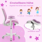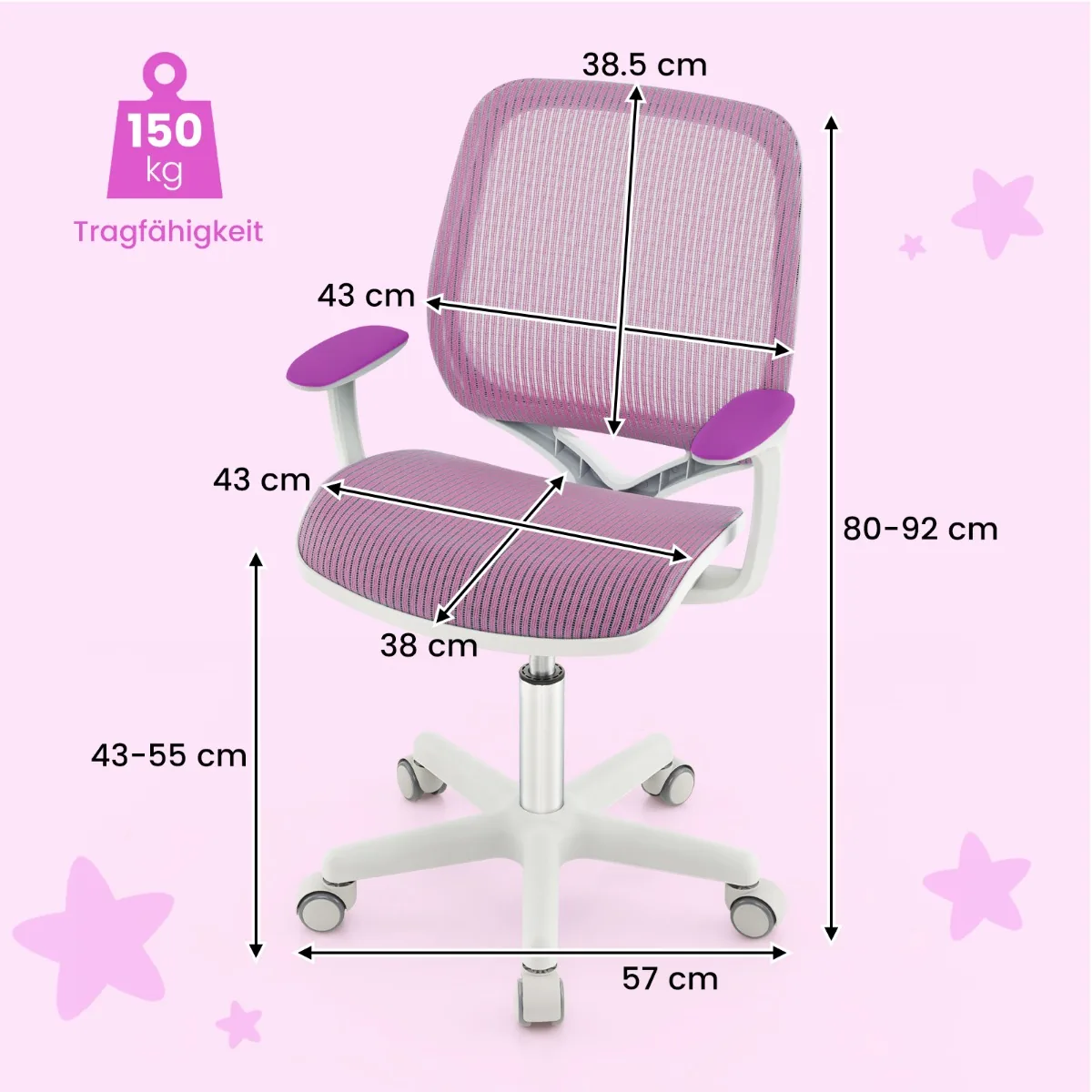 Vaikiška biuro kėdė 57x57x92 cm baltos ir violetinės spalvos skirta vaikams nuo 6 iki 15 metų. Reguliuojamo aukščio ir ergonomiško dizaino kėdė užtikrina patogų sėdėjimą mokantis ar žaidžiant. Dėl kvėpuojančio nailono tinklinio audinio ir 360° pasukimo funkcijos ši kėdė puikiai pritaikoma vaikų poreikiams.