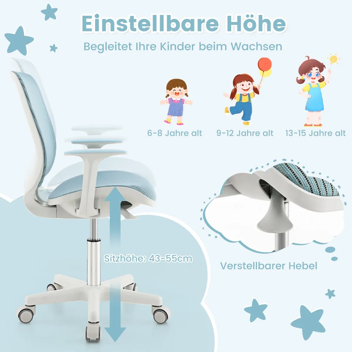 Vaikiška biuro kėdė 57x57x92 cm, pilkos ir mėlynos spalvos, skirta 6–15 metų vaikams. Reguliuojamo aukščio ir ergonomiška kėdė užtikrina patogų sėdėjimą mokymosi ar žaidimų metu. Tinklinis audinys ir 360° pasukimas suteikia papildomą komfortą ir funkcionalumą vaikų kambario ar darbo vietos aplinkoje.