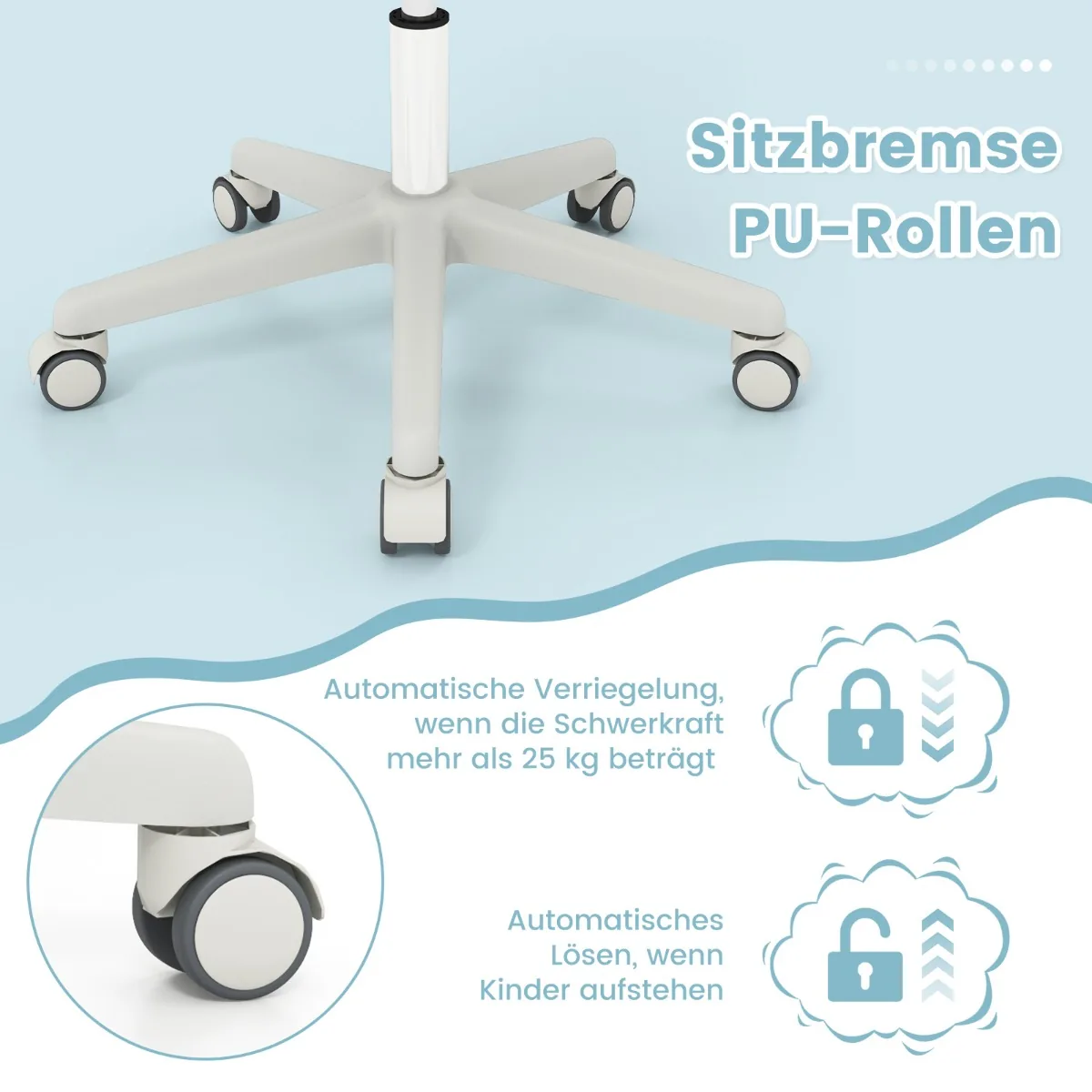 - Stabdžių ratukai automatiškai fiksuojasi esant virš 25 kg ir atsipalaiduoja vaikui atsistojus.