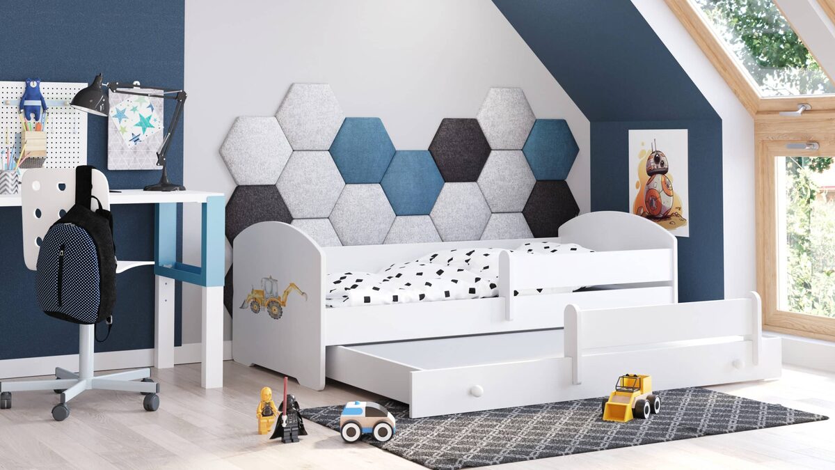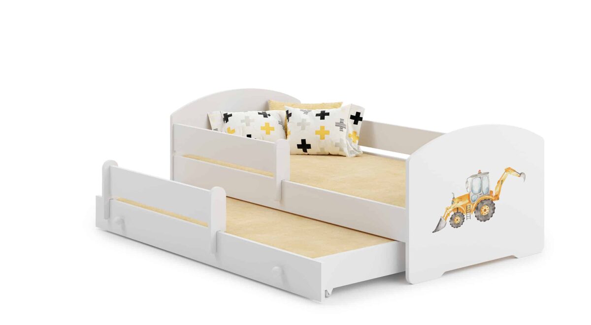 Vaikiška dvigulė lova Luk su čiužiniu ir apsauginiu barjeru 164x85x63 / 145x80x15cm, ekskavatorius