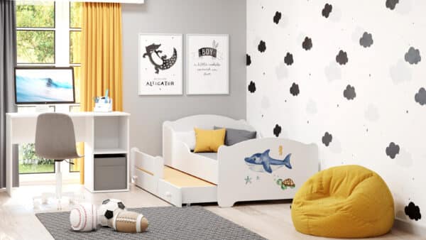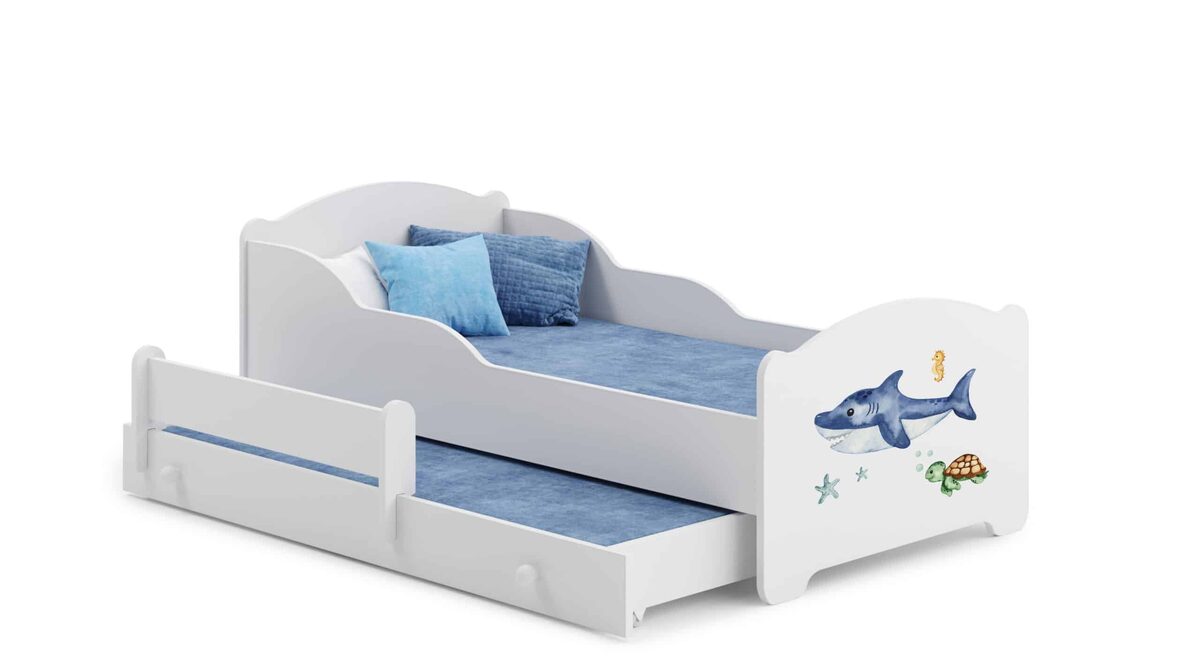Vaikiška dvigulė lova Michas su čiužiniu ir apsauginiu barjeru 164x85x63 / 145x80x15cm, ryklys