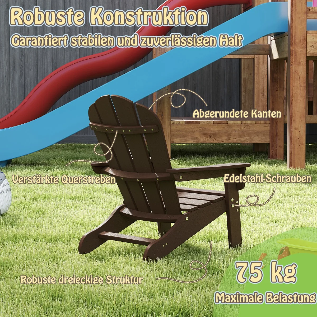 - Vaikiška Adirondack kėdė sukurta atsižvelgiant į vaikų saugumą ir patogumą.