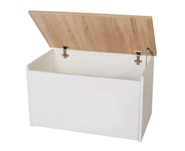 Komodos sklendė atsidaro į viršų su dujų pavara, todėl ją lengva ir patogu naudoti. Laminuota baldų lenta suteikia gaminiui estetišką išvaizdą ir apsaugo nuo kasdienio nusidėvėjimo.