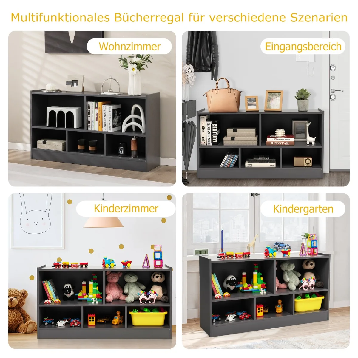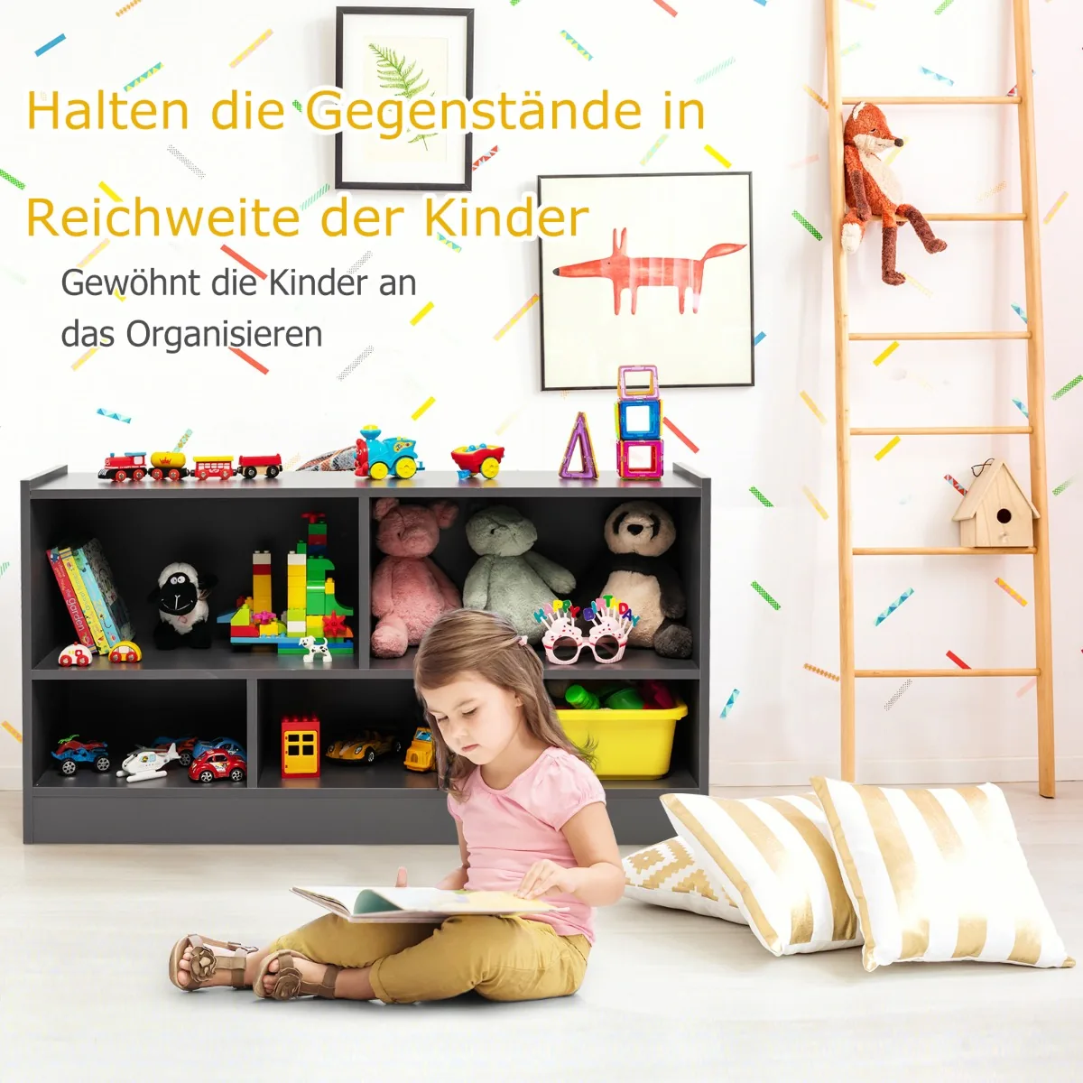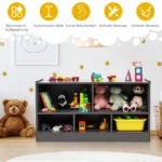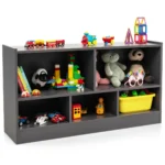 Vaikiška lentyna 111x30x61,5 cm tamsiai pilkos spalvos puikiai tinka vaikų kambariui, žaidimų erdvei ar svetainei. Ši 5 skyrių lentyna užtikrina tvarką ir leidžia patogiai sudėti žaislus, knygas ar meno reikmenis.