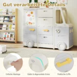 - Vaikiškoje lentynoje yra 4 stalčiai su rankenomis ir 2 spintelės, skirtos žaislų, knygų ir meno priemonių laikymui.