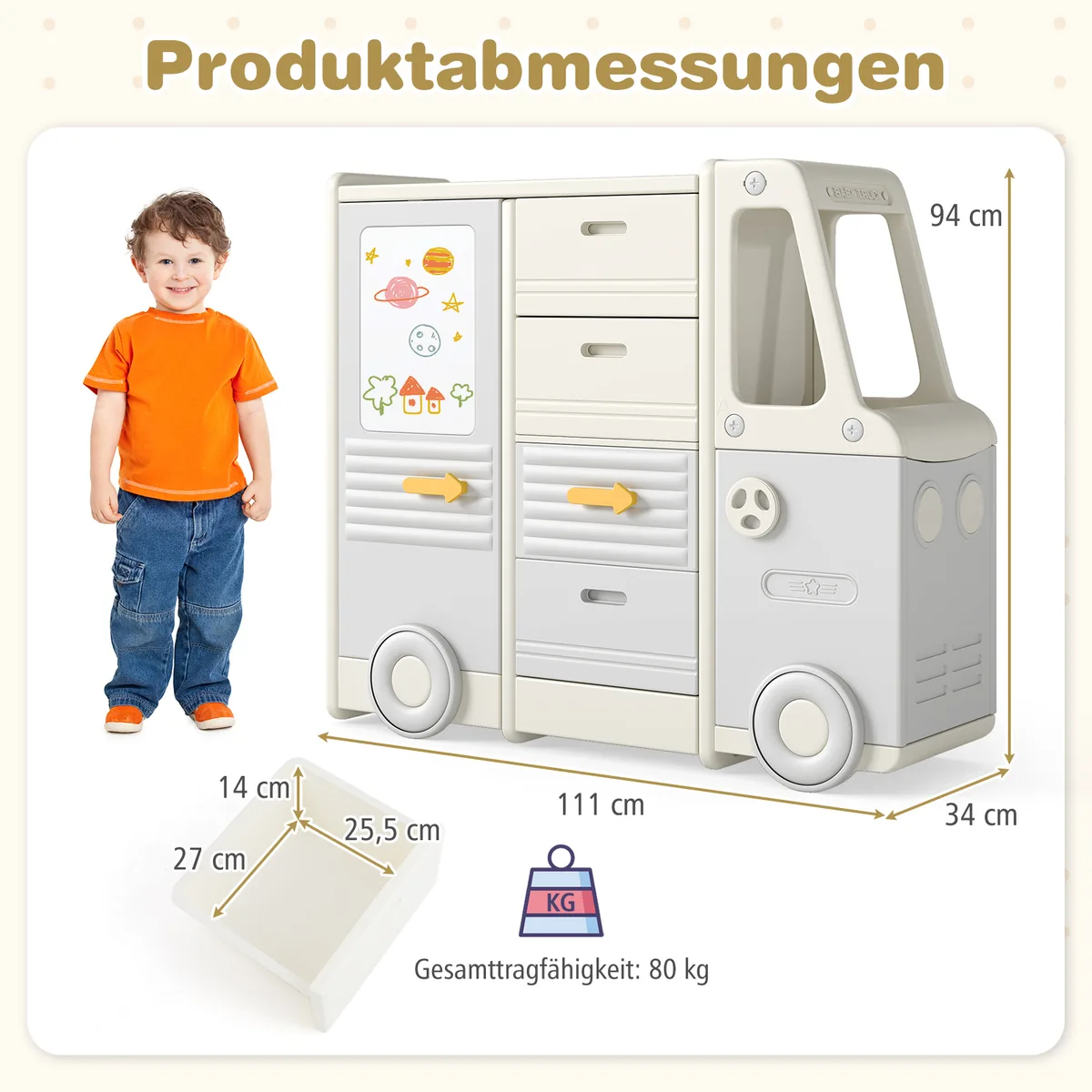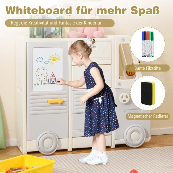 Vaikiška lentyna 111x34x94 cm, smėlio ir pilkos spalvų, suteikia patogią ir saugią vietą žaislų, knygų bei meno reikmenų laikymui. Dėl autobuso formos ir integruotos lentos ji skatina vaikų kūrybiškumą ir žaidimą kambaryje ar darželyje.