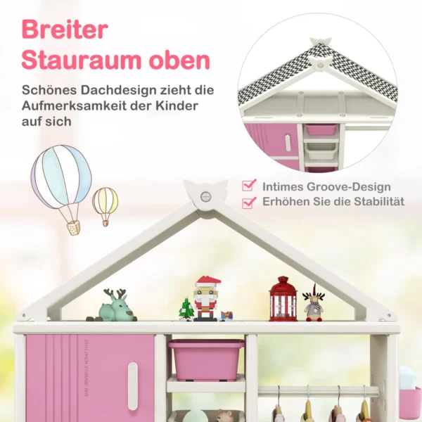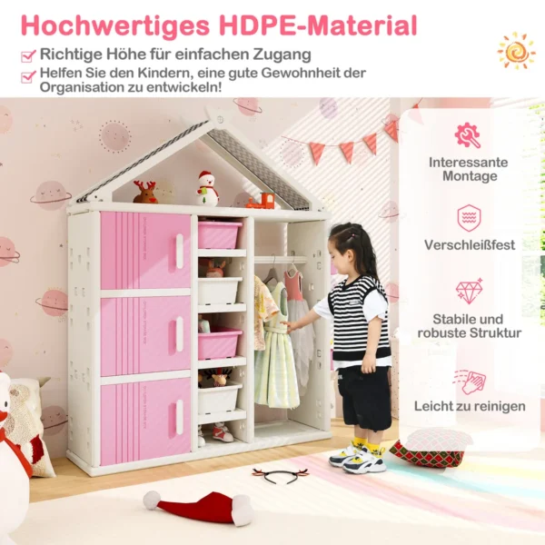 - Tvirtas pakabinamas strypas ir 4 reguliuojamos atviros lentynos su dėžėmis suteikia erdvę drabužiams ir žaislams.