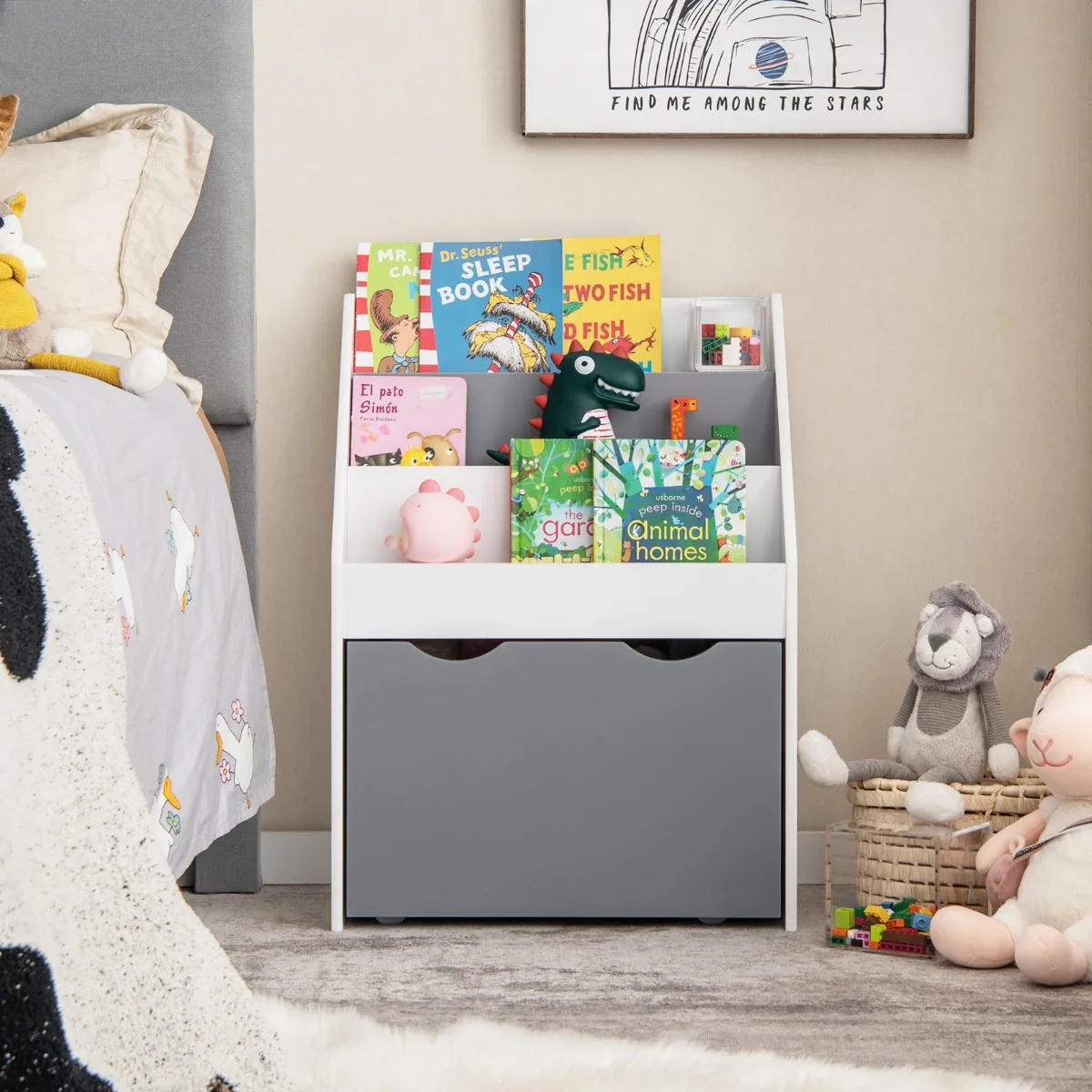 • Didelė trijų pakopų knygų lentyna su žaislų dėže apačioje.
