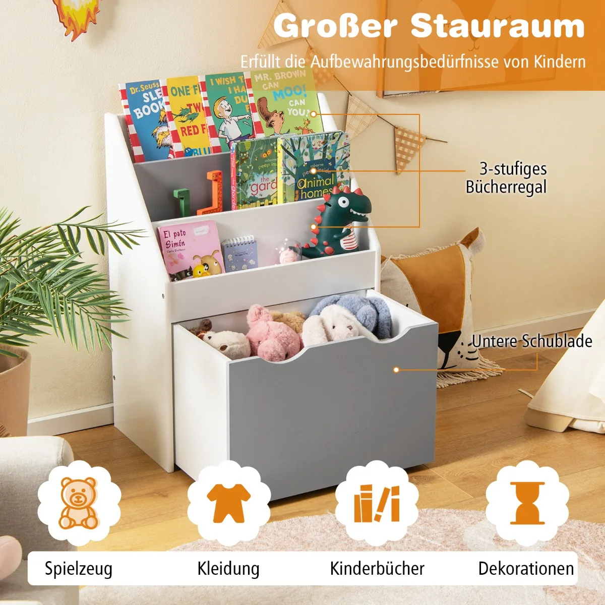 • Trijų pakopų lentyna ir žaislų dėžė apačioje skirta vaikų knygoms, žaislams ir drabužiams laikyti.