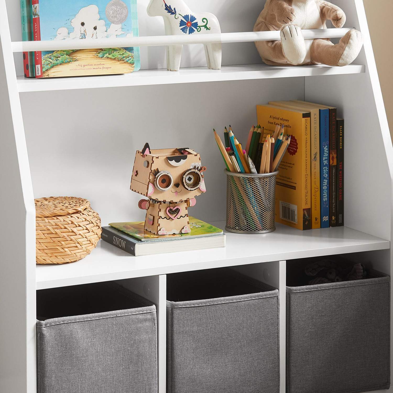 Vaikiška lentyna 63x28x80 cm, baltos/pilkos spalvos, yra puikus sprendimas tvarkingam žaislų ir kitų daiktų laikymui. Ši lentyna padeda vaikams ugdyti gerus tvarkos įpročius nuo ankstyvo amžiaus, nes jos aukštis – 80 cm – leidžia vaikams patiems pasiekti ir susitvarkyti savo žaislus.