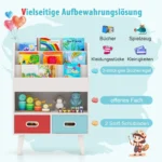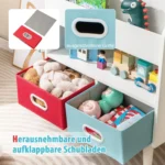 Vaikiška lentyna 63x30x97 cm, baltos spalvos, skirta tvarkingai ir saugiai laikyti vaikų knygas, žaislus ir smulkmenas. Patogi konstrukcija su 3 pakopų lentyna, atviru skyriumi ir 2 medžiaginiais stalčiais leidžia efektyviai organizuoti vaikų daiktus. Lentyna pagaminta iš MDF ir dirbtinės medienos, pritaikyta vaikų saugumui su suapvalintais kampais ir tvirtinimo prie sienos įtaisais.